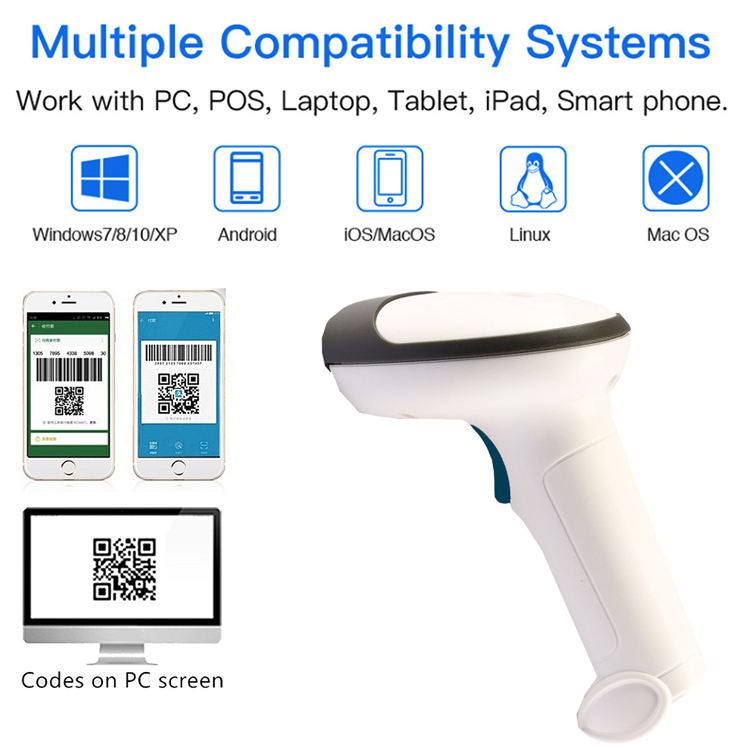 เครื่องอ่านบาร์โค้ด QR แบบใช้สาย USB 2D ไร้สายแบบพกพาเครื่องอ่านบาร์โค้ดสถานการณ์ POS สินค้าในสต็อก