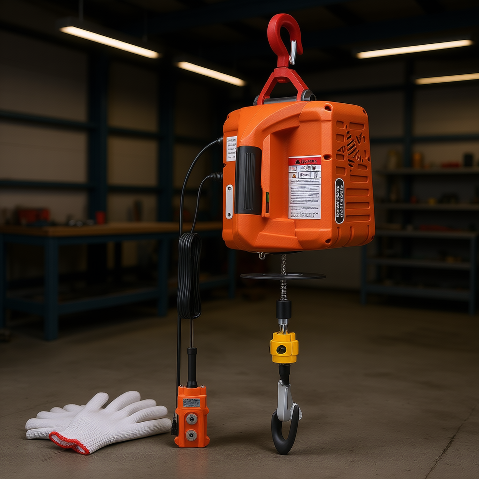 รอกไฟฟ้าแบบพกพา 1100 ปอนด์ 110 โวลต์ ความสูงยก 25 ฟุต พร้อมรีโมทไร้สาย สีส้ม