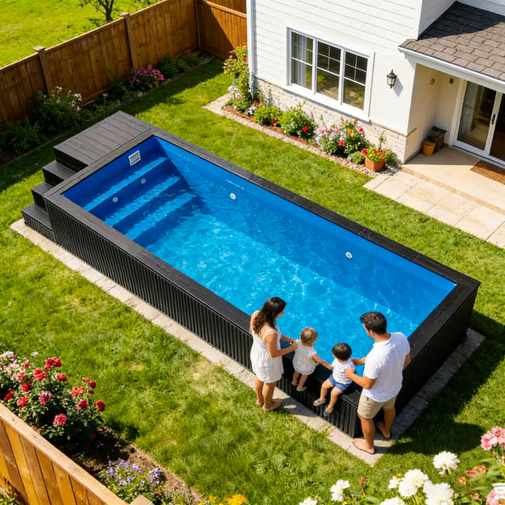 สระว่ายน้ำสำเร็จรูปแบบพกพา ทำจากไฟเบอร์กลาสและ WPC สำหรับเด็กและครอบครัว สระกลางแจ้งแบบตั้งพื้น สระคอนเทนเนอร์ใช้งานได้จริง สระว่ายน้ำกลางแจ้งสำหรับครอบครัว
