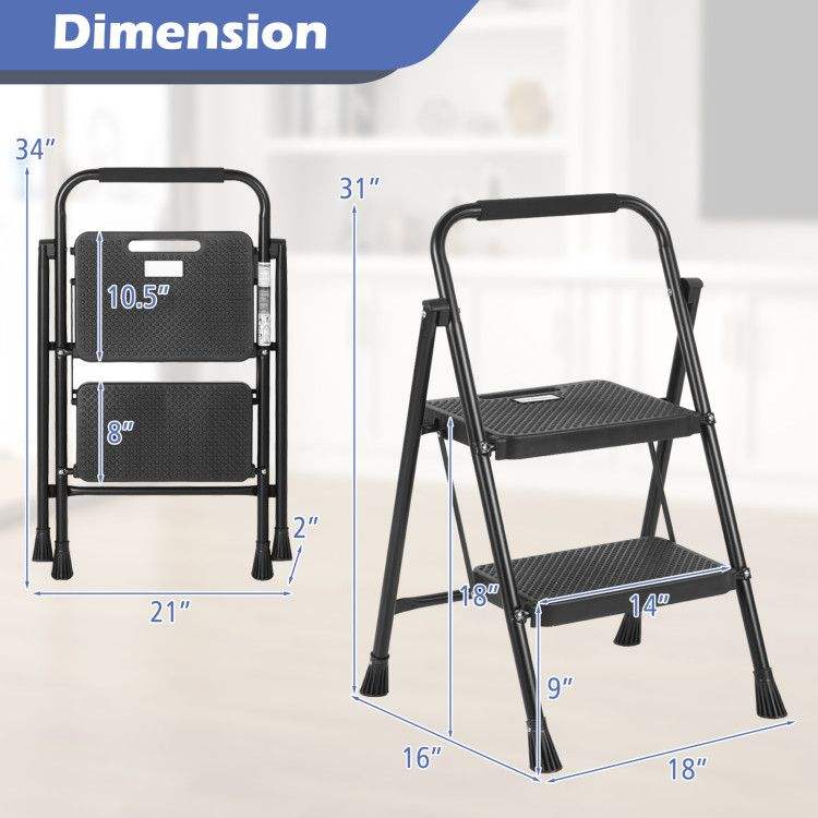 บันไดพับได้ 2 ขั้นแบบพกพาพร้อมแป้นกันลื่นแบบกว้างสำหรับใช้ในบ้านและสำนักงาน