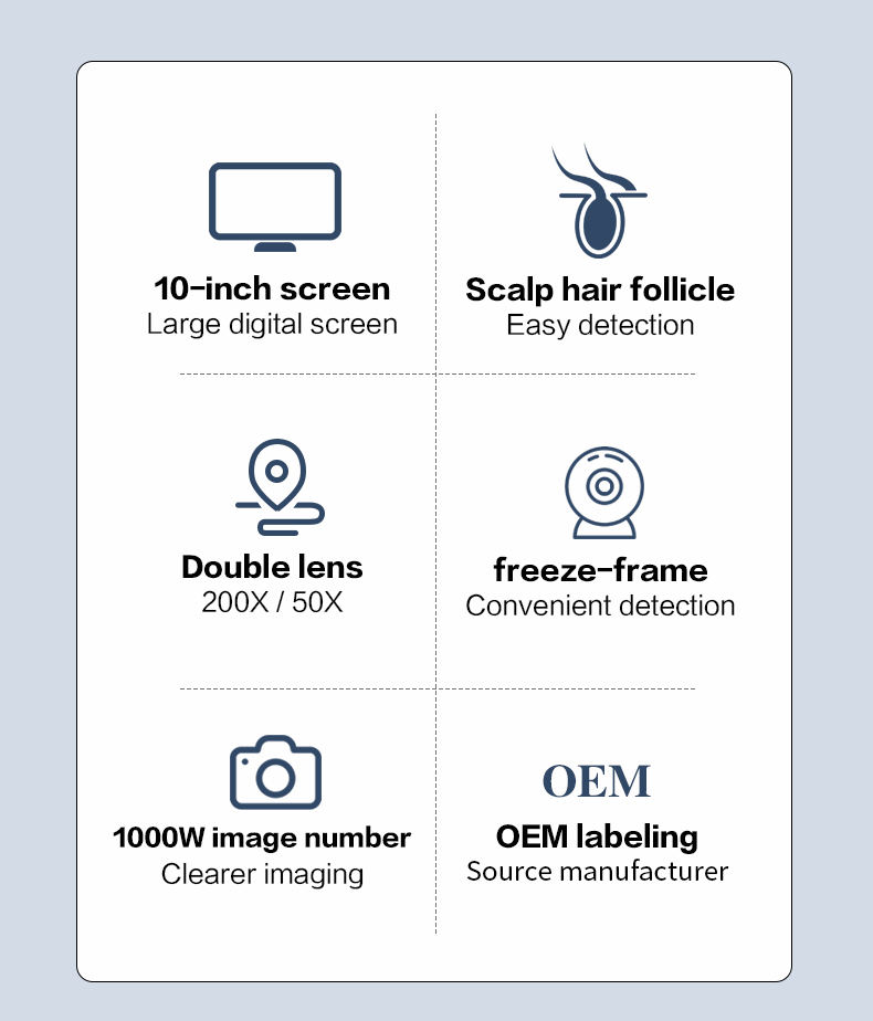 เครื่องวิเคราะห์เส้นผมแบบพกพาเครื่องวิเคราะห์เส้นผม10นิ้วเครื่อง50X หน้าจอ HD/หัววัด200X สำหรับร้านเสริมสวยและใช้ในบ้าน