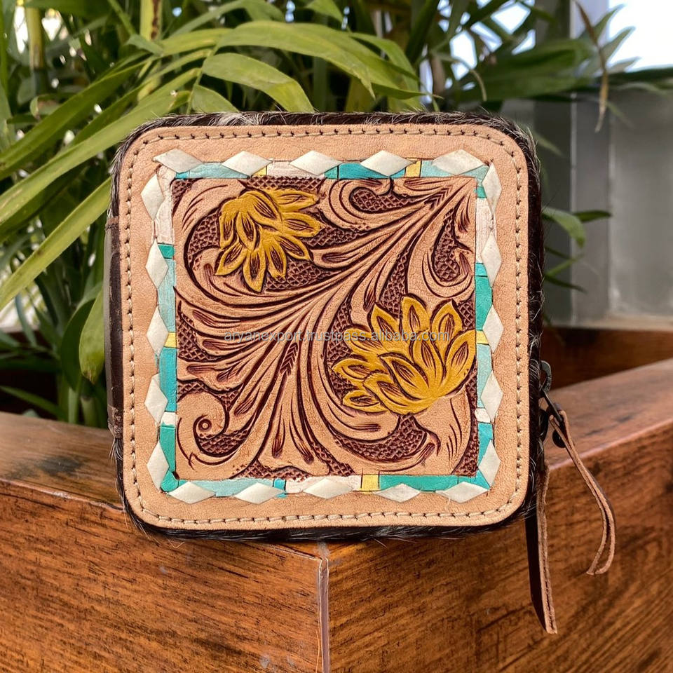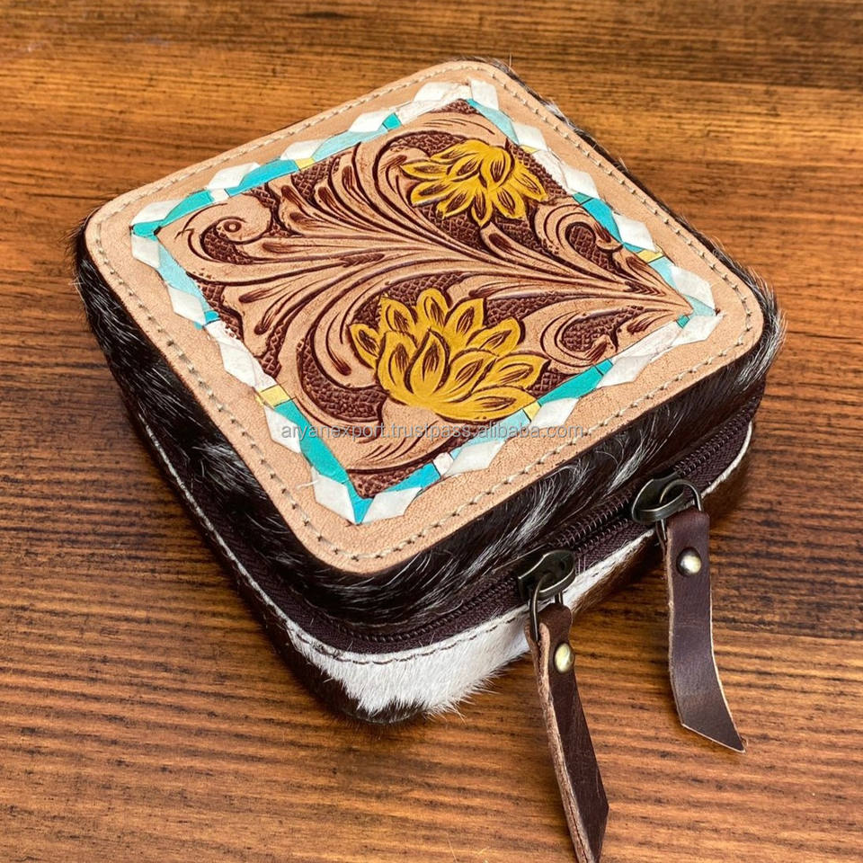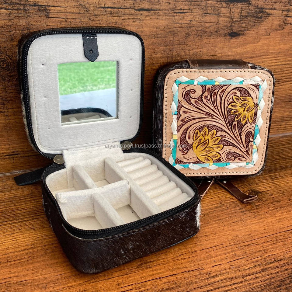 Portable Hand Tooled Leather Jewelry Box Small Jewelry Case for Women Cowhide Mini Jewelry Organizer Storage Boxes with Mirror