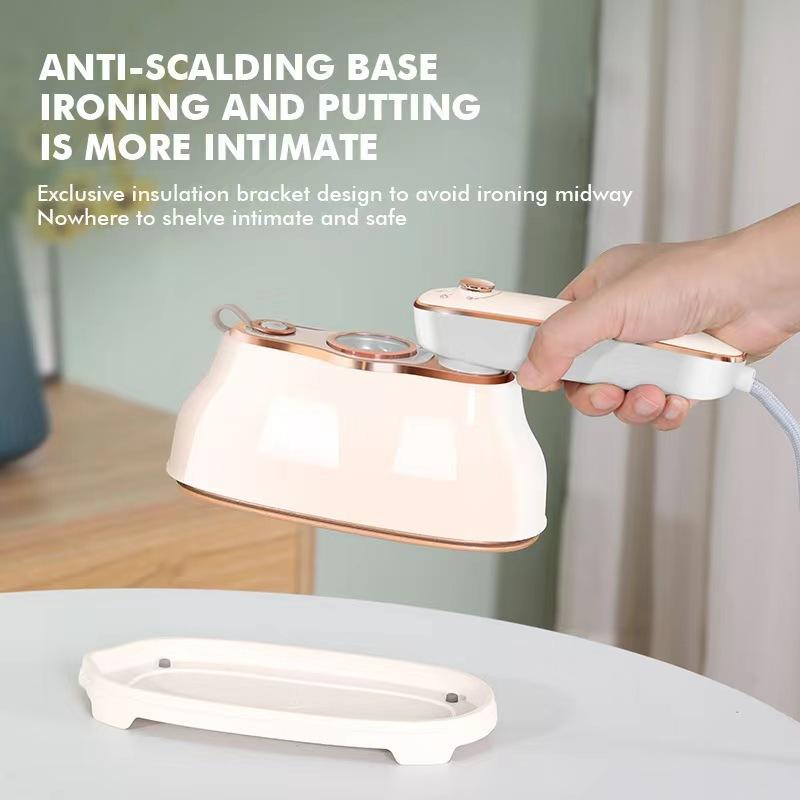 เครื่องรีดผ้าไอน้ำแบบพกพา สีขาวเบจ มาการอง ความจุ 0.8 ลิตร ใช้งานด้วยระบบไฟฟ้าและกลไก เหมาะสำหรับใช้ในบ้านและการเดินทาง