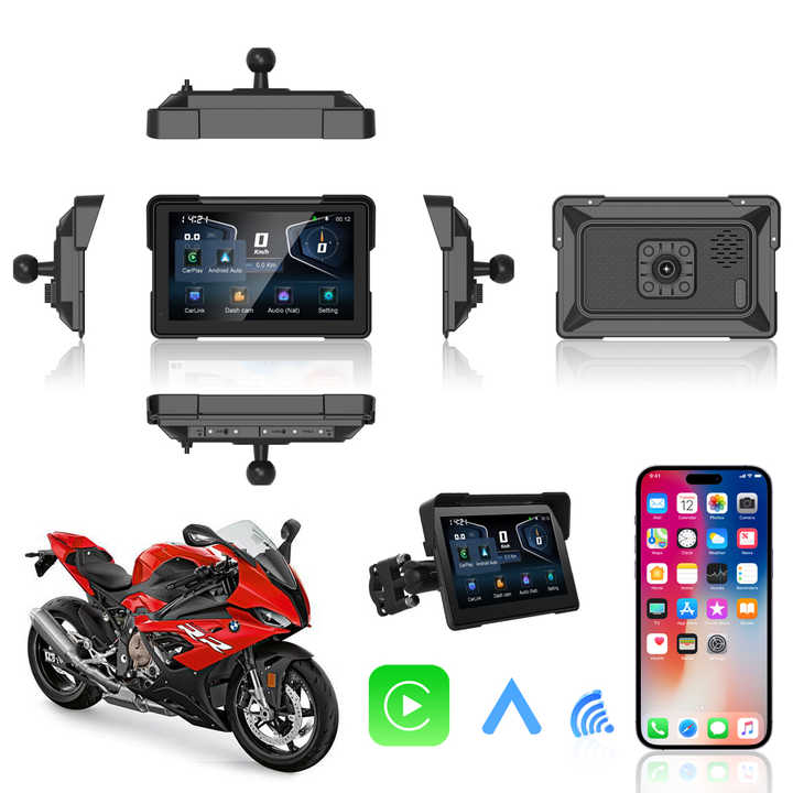 เครื่องบันทึกภาพแบบพกพา IP67 หน้าจอ 7 นิ้ว รองรับ Carplay และ Android Auto สำหรับมอเตอร์ไซค์ พร้อมระบบนำทาง GPS และ TPMS ไร้สาย พร้อมระบบ BSD