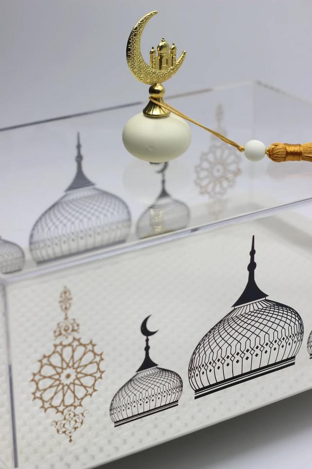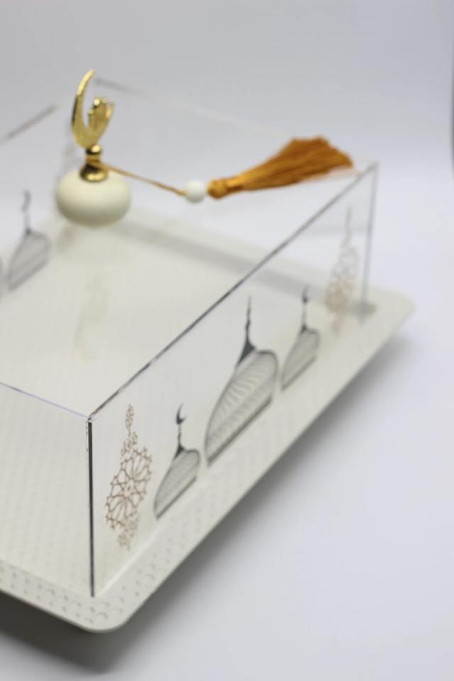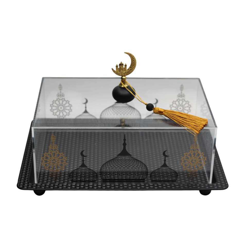 กล่องเสิร์ฟทำจากอะคริลิคโลหะแบบอิสลามแบบพกพากล่องเสิร์ฟพร้อมฝาปิดรูปโดมสำหรับตกแต่งโต๊ะ