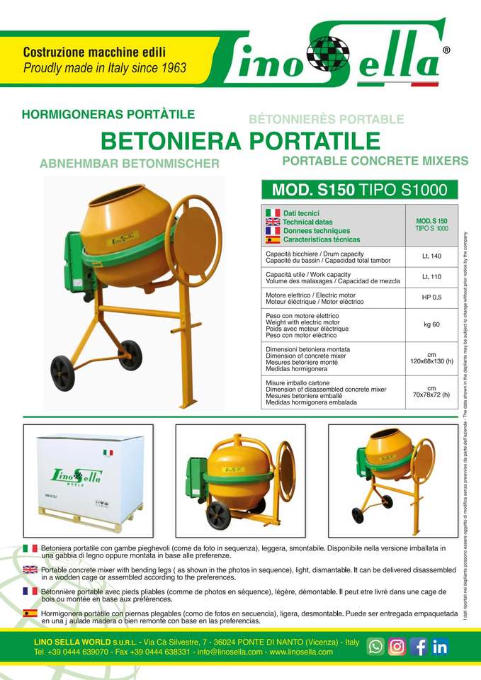 เครื่องผสมปูนซีเมนต์แบบพกพา Lino Sella ทำจากเหล็ก แบบเทด้วยมือ สำหรับงานก่อสร้าง ขนย้ายง่าย เหมาะสำหรับโรงงานผลิต และใช้ในบ้าน ความจุ 150 ลิตร