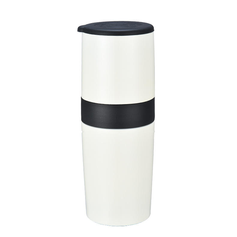 เครื่องบดกาแฟแบบพกพา ดีไซน์มินิมอลสีขาวพลาสติก พร้อมแถบสีดำและฝาปิด สำหรับการเดินทาง