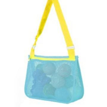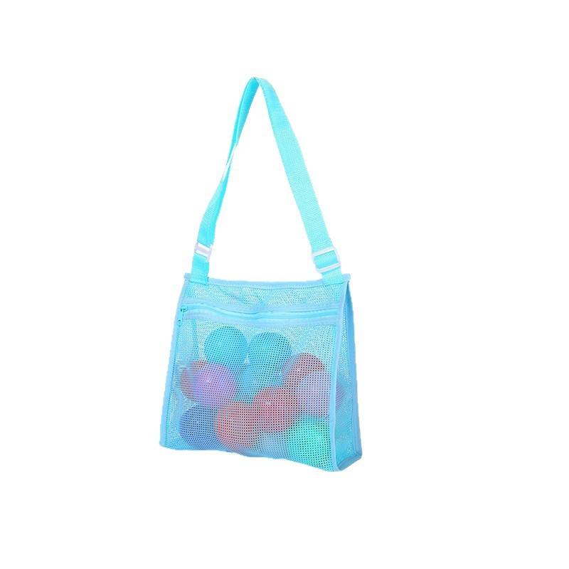 กระเป๋าชายหาดตาข่ายแบบพกพาพร้อมสายสะพายสำหรับเก็บชุดว่ายน้ำและใช้งานกลางแจ้ง มีตัวเลือกสีฟ้าให้เลือก