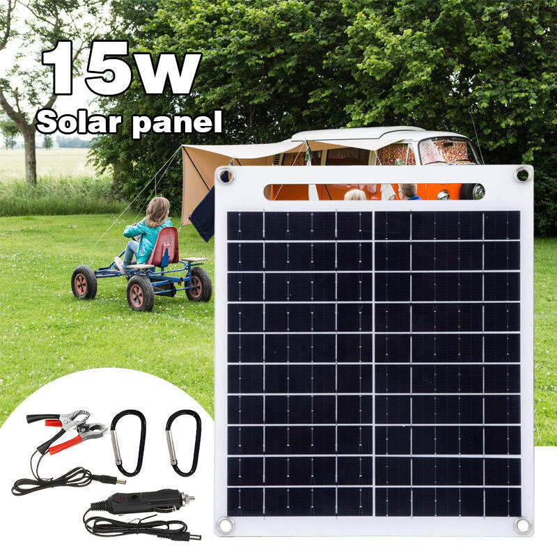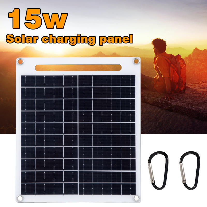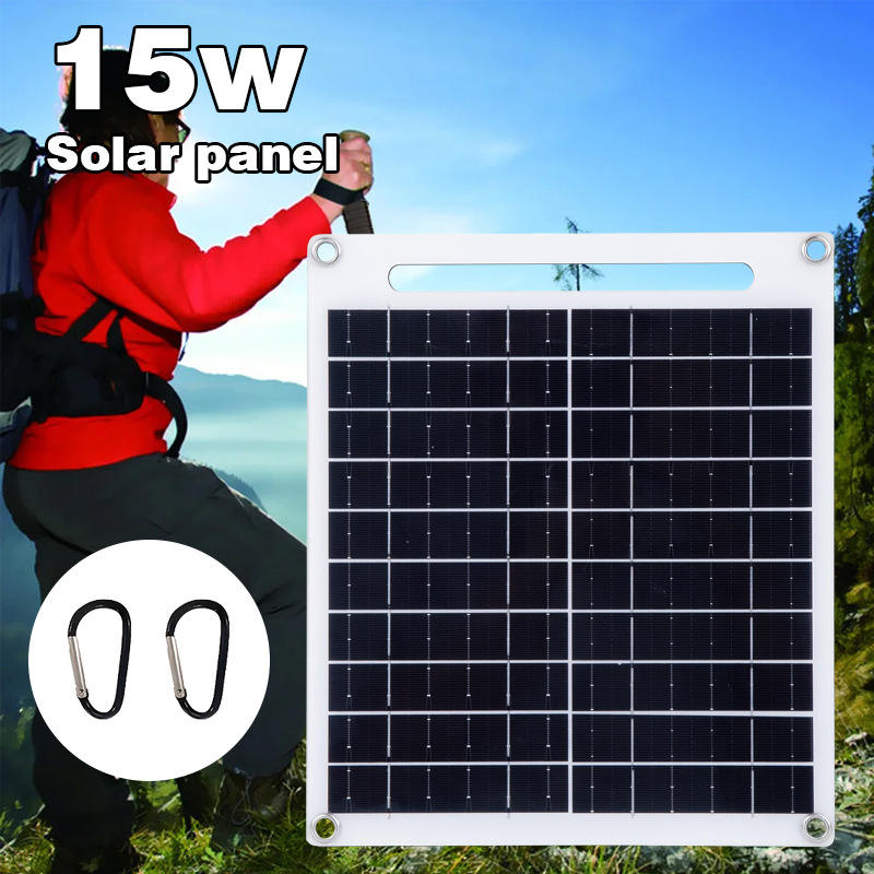 แผงโซลาร์เซลล์แบบพกพาชนิดโมโนคริสตัลไลน์ 15W 12V ชาร์จ USB คู่แบบพับได้สำหรับการเดินป่าตั้งแคมป์กลางแจ้ง