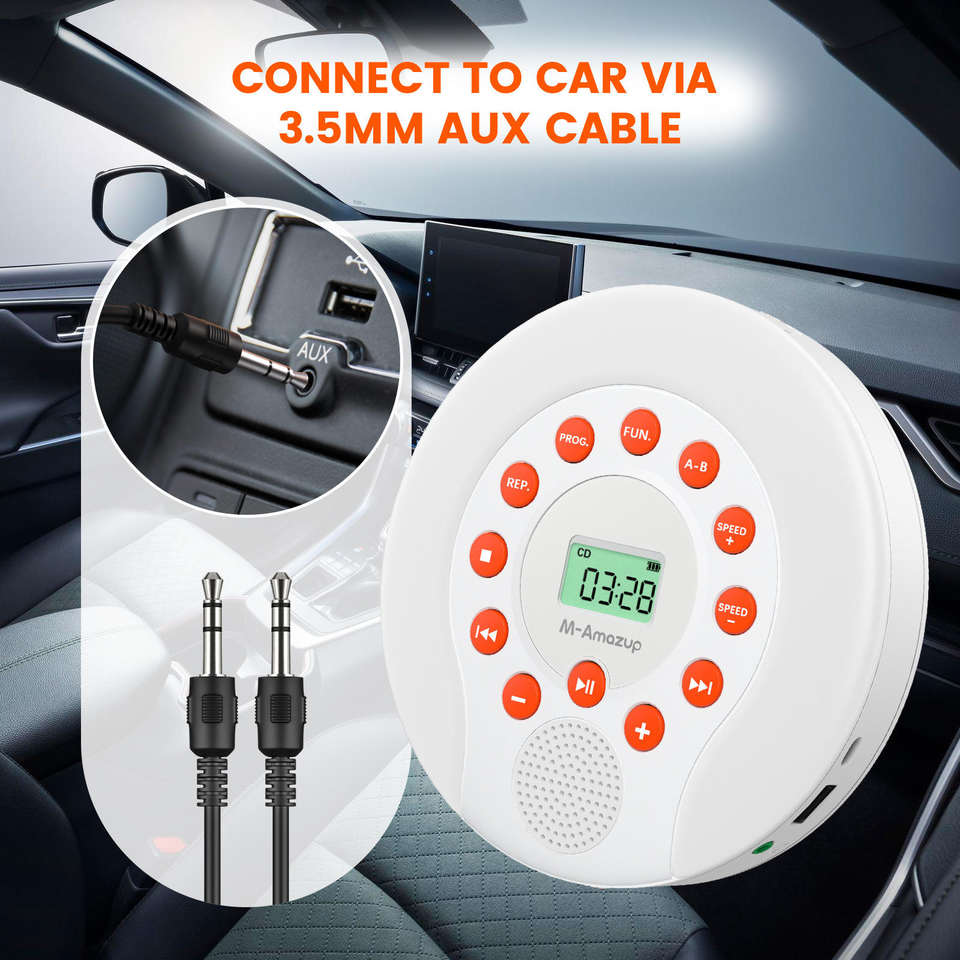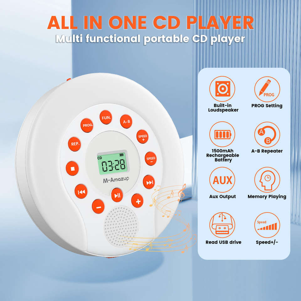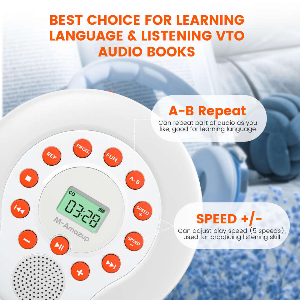 เครื่องเล่นซีดีส่วนตัวแบบพกพา A B ปรับความเร็วซ้ำได้ ลำโพงในตัว เล่นผ่าน USB แบตเตอรี่แบบชาร์จได้ 1500mAh สำหรับรถยนต์ การเรียนรู้ที่บ้าน