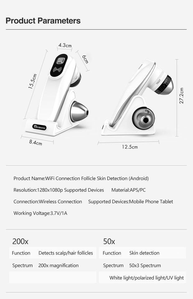 เครื่องตรวจจับใบหน้าอัจฉริยะแบบพกพาเครื่องวิเคราะห์ผิวไร้สายไวไฟวิเคราะห์เส้นผมและหนังศีรษะ