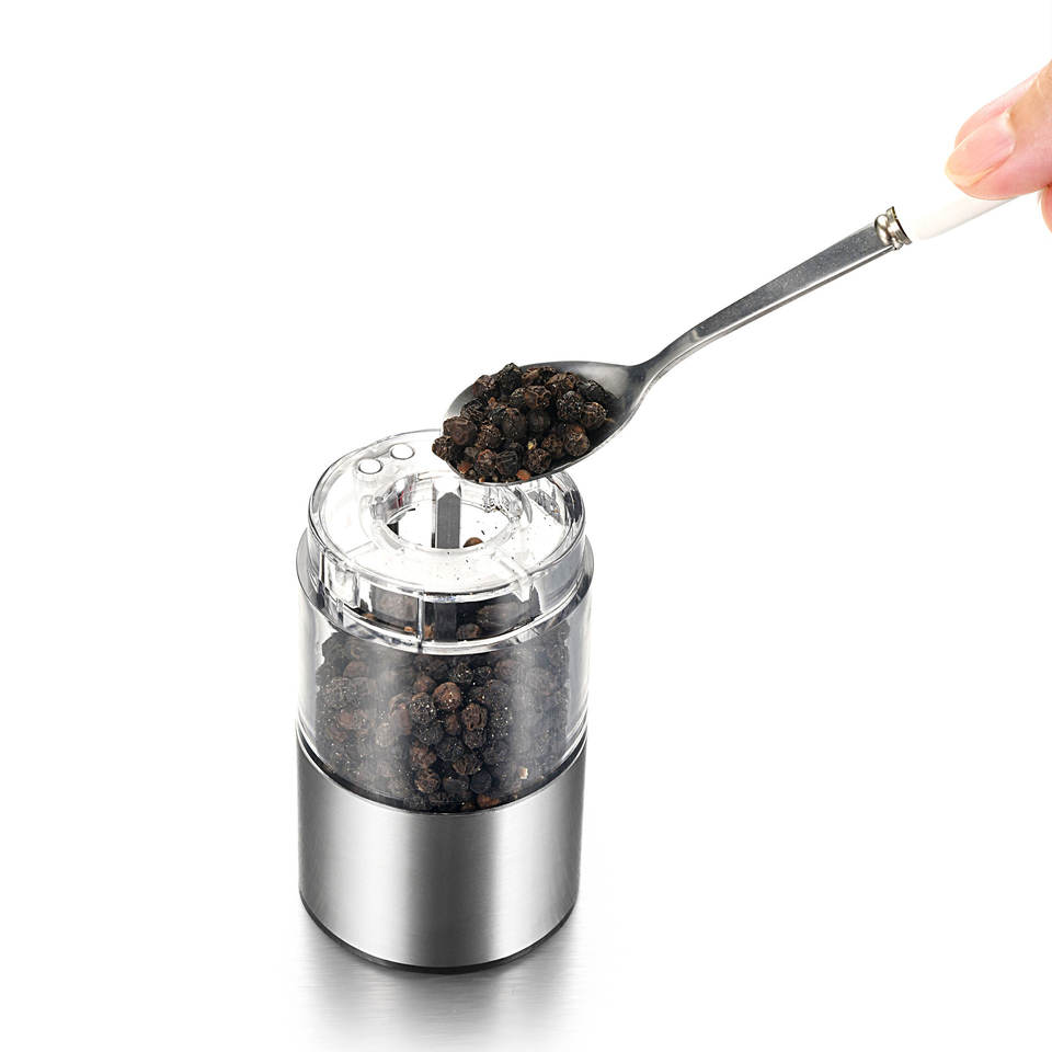 เครื่องบดพริกไทยไฟฟ้าสแตนเลสแบบพกพา Mg705c ใช้แบตเตอรี่ ปุ่มกด เครื่องมือครัวสำหรับบดปรุงรส
