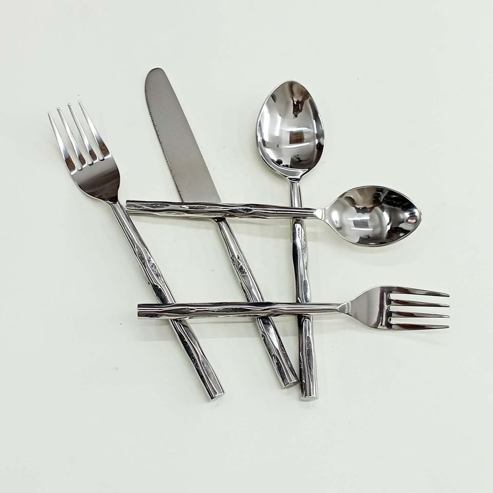 ชุดเครื่องใช้บนโต๊ะอาหารสแตนเลสแบบพกพามีด้ามจับดีไซน์หยาบชุดช้อนขัดกระจกสีเงินทำจากสแตนเลส