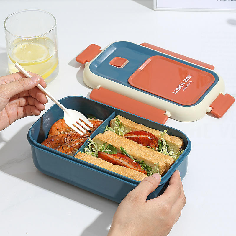 กล่องอาหารกลางวันแบบพกพาสำหรับนักเรียน ผู้ใหญ่ และเด็ก กล่องเบนโตะมีหูหิ้ว 2 ช่อง พร้อมช้อนส้อม 1100 มล.