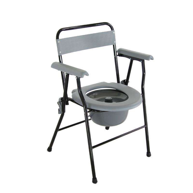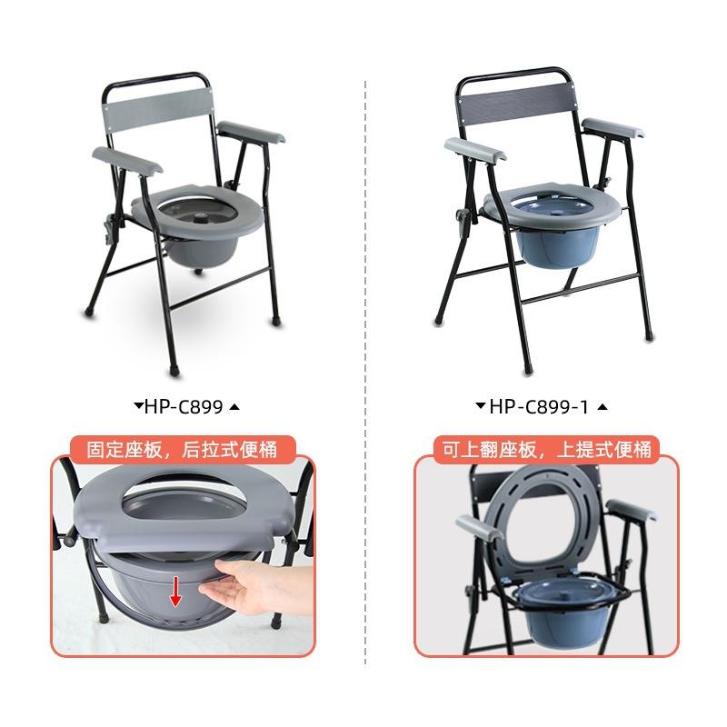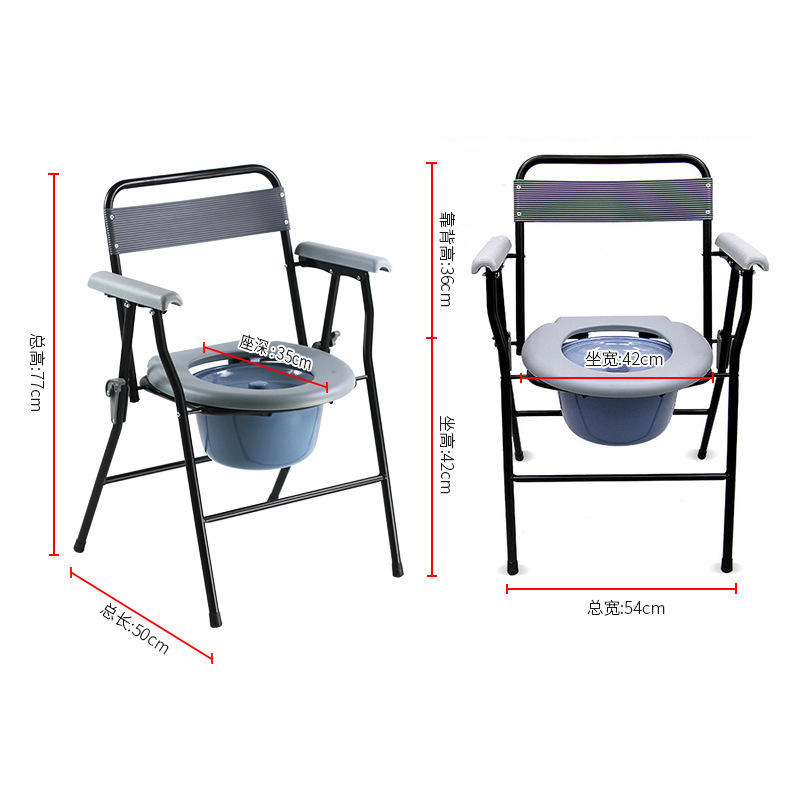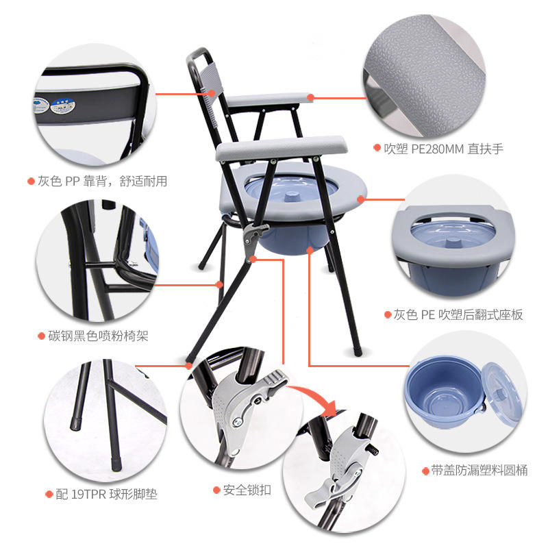 ที่นั่งชักโครกแบบพกพาพร้อมดีไซน์กันลื่นสำหรับผู้สูงอายุและใช้ในบ้าน เก้าอี้พับทรงกลมพร้อมถังและฝาปิด