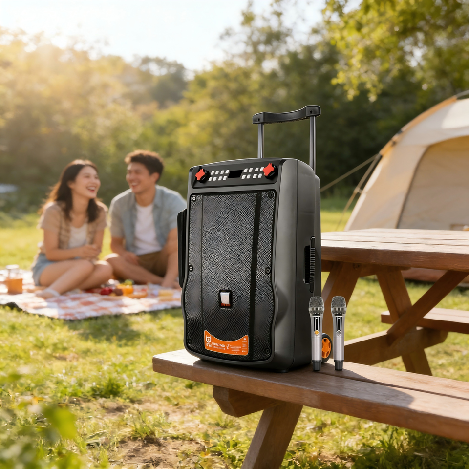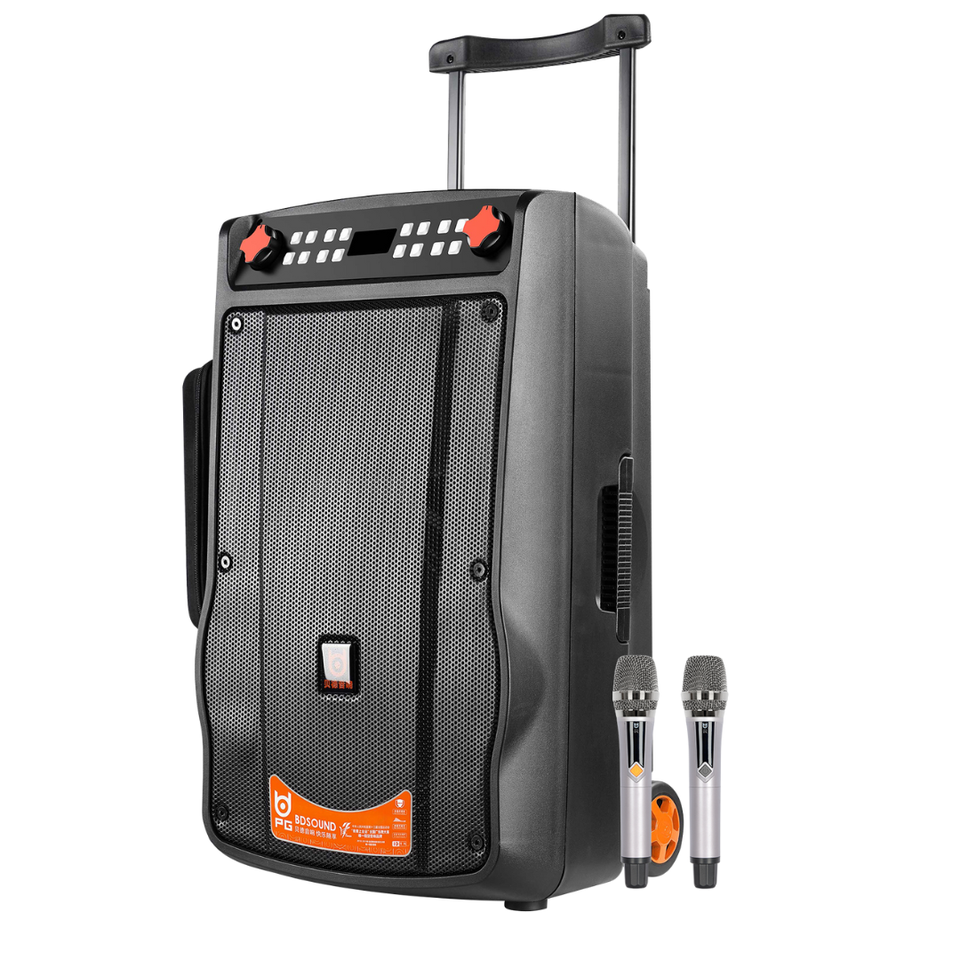 ลำโพงล้อลากพกพาพร้อมไมโครโฟนไร้สาย UHF คู่, วูฟเฟอร์ 12 นิ้ว, บลูทูธ, บันทึกเสียงผ่าน USB, เหมาะสำหรับงานปาร์ตี้กลางแจ้งและคาราโอเกะ