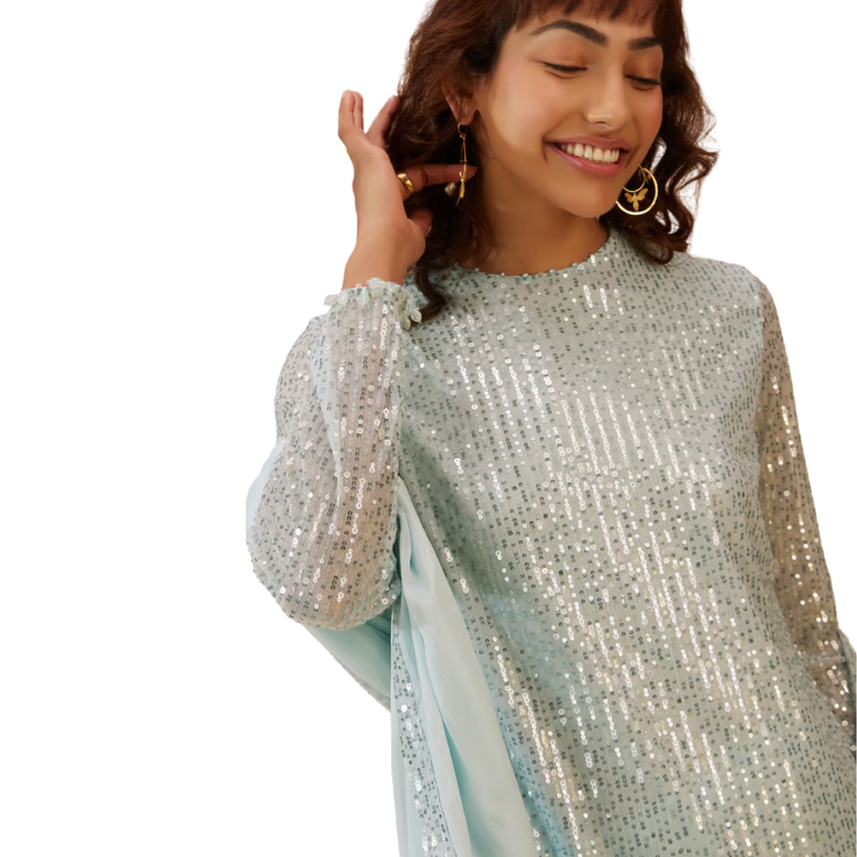 ชุดสูทพาลาซโซสีฟ้าผงเลื่อมสำหรับผู้หญิงเสื้อผ้าชาติพันธุ์ OEM ชุดปาร์ตี้งานแต่งงานออกแบบได้ตามต้องการ
