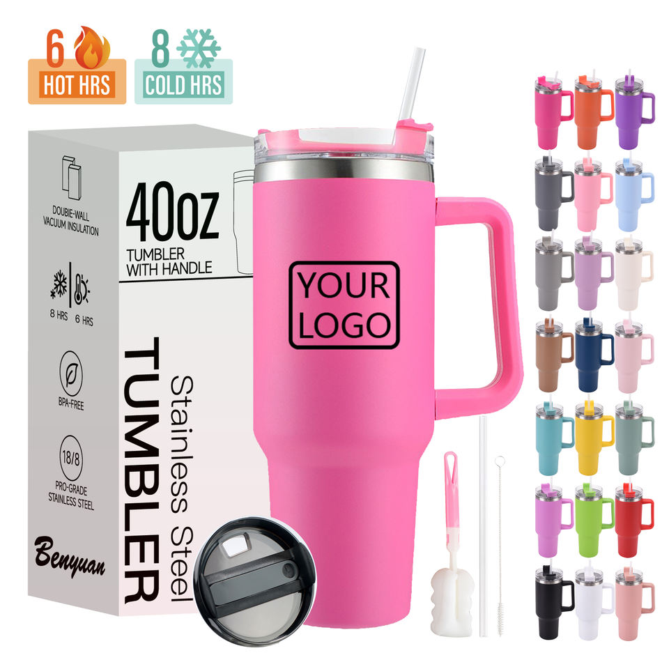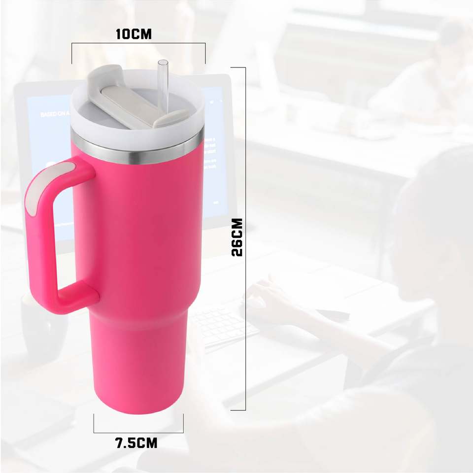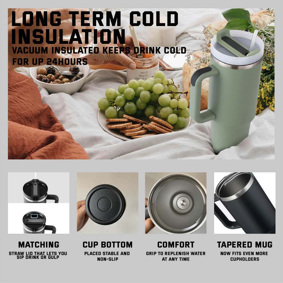 แก้วน้ำเก็บความร้อนสุญญากาศแบบผนังสองชั้น ขนาด 40 ออนซ์ ผลิตจากสแตนเลสสตีล 18/8 พร้อมหูจับและหลอดดูดเคลือบสีฝุ่น