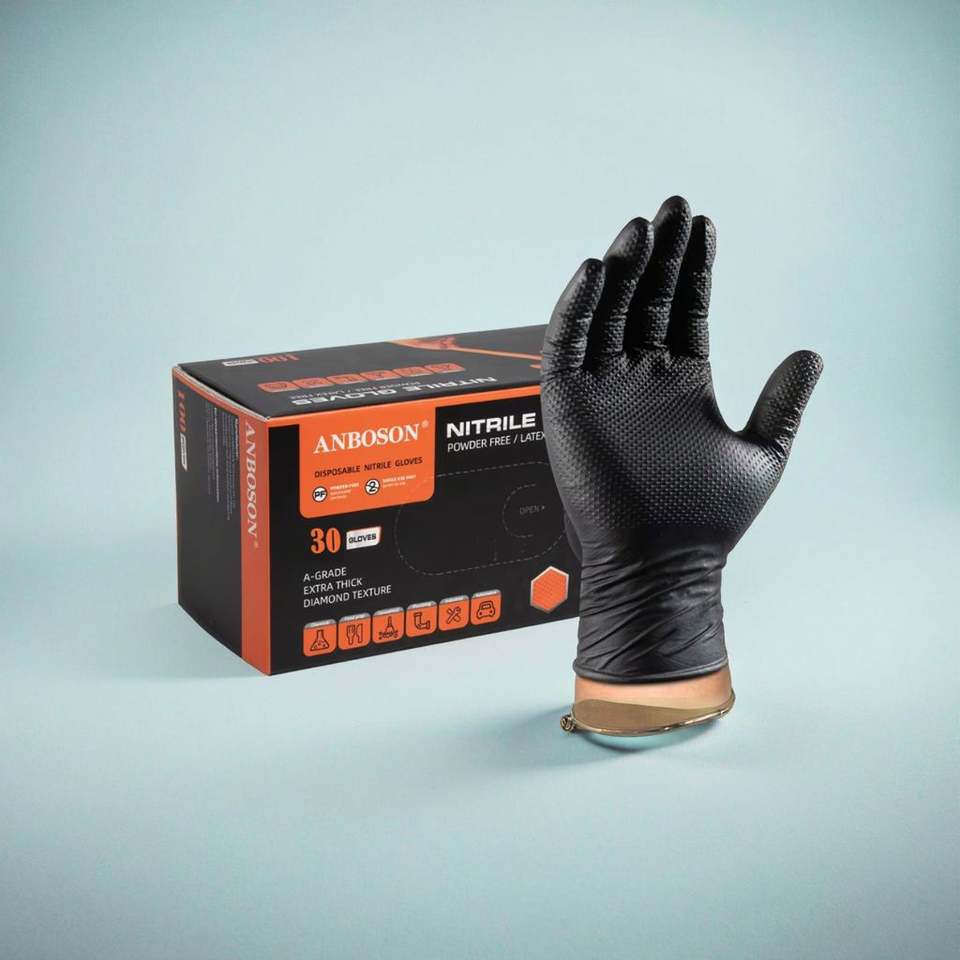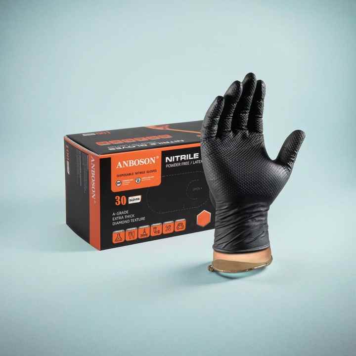 ถุงมือไนไตรล์แบบใช้แล้วทิ้งไม่เป็นผงลายเพชร8Mil สำหรับช่างยนต์และจัดการอาหารสีดำทนทาน