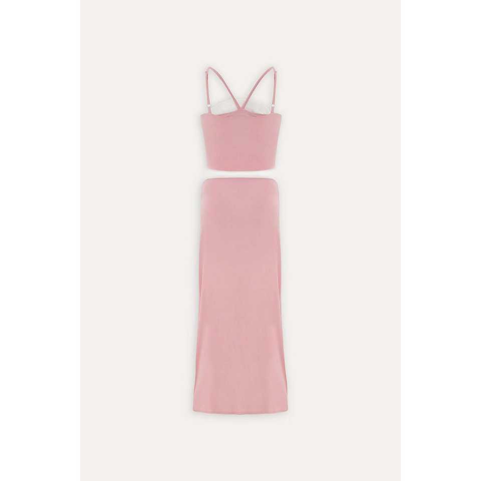 ชุดเซ็ตเสื้อและกางเกงขาสั้นสีชมพูพาสเทล 2 ชิ้น สำหรับเล่นกีฬาฤดูร้อน เสื้อครอปสั้นและกางเกงขาสั้นเหนือเข่า