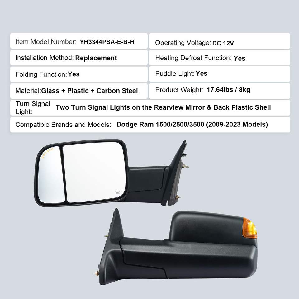 กระจกลากจูงความร้อนแรงสูงสำหรับ2009-2018 Dodge Ram 1500 2010-2018 2500 3500 2019-2023 Ram 1500รุ่นคลาสสิก