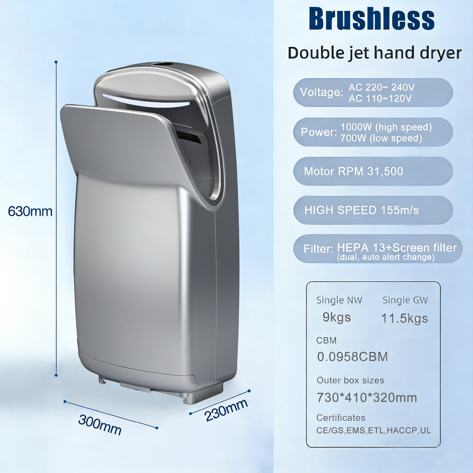 มอเตอร์ไร้แปรงถ่านกำลังสูง 1000 วัตต์ (31,500 รอบต่อนาที) เครื่องเป่ามือ แห้งเร็วพิเศษใน 10 วินาที พร้อมความเร็วลม 155 เมตร/วินาที ตัวกรอง HEPA