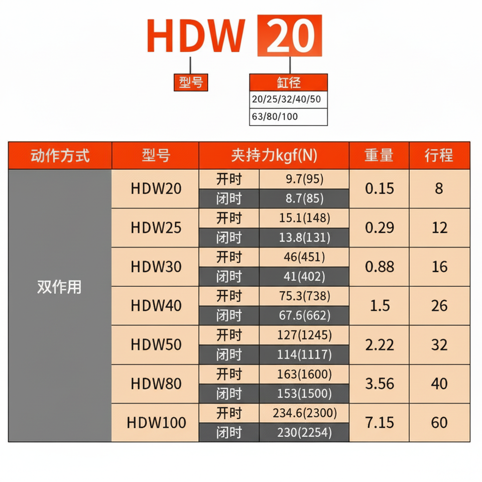 กระบอกลมนิ้วมือขนาดเล็กทรงพลัง HDW-20/25/32/40/50/63 สำหรับหุ่นยนต์แบบขนาน ตัวจับแบบกลไก