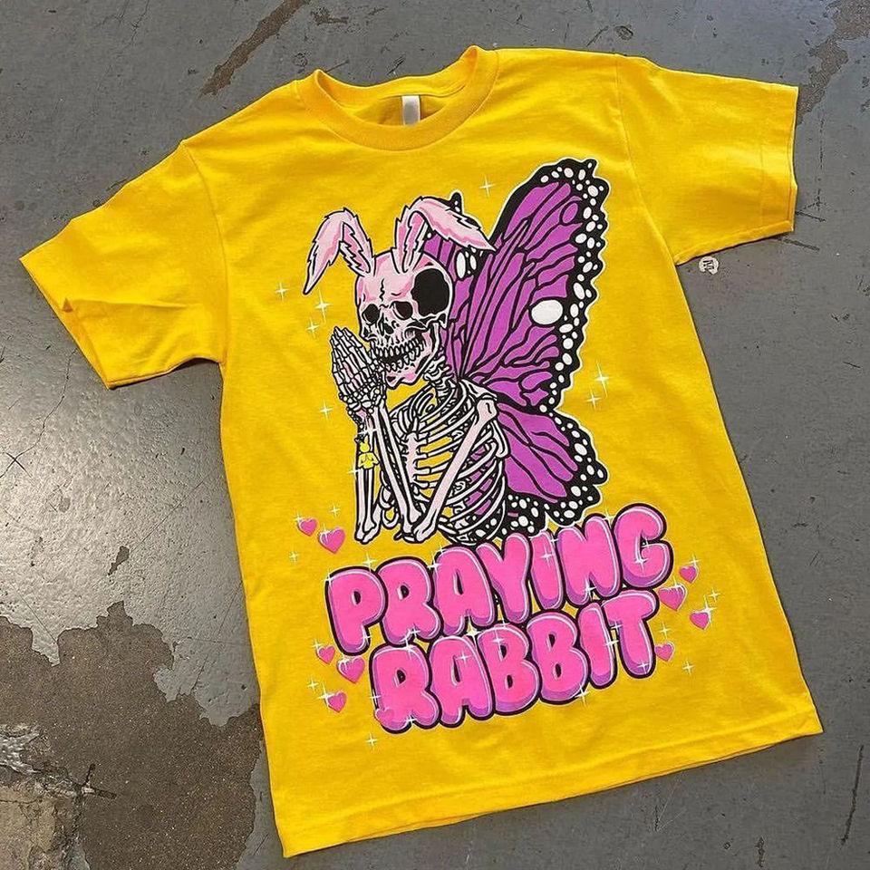 เสื้อยืดกราฟิกกระต่ายสวดมนต์ลายผีเสื้อ สีเหลือง ไซส์ใหญ่ ลายแมลงปอกระต่ายสวดมนต์ สุดน่ารัก สไตล์สยองขวัญ สำหรับทุกเพศ