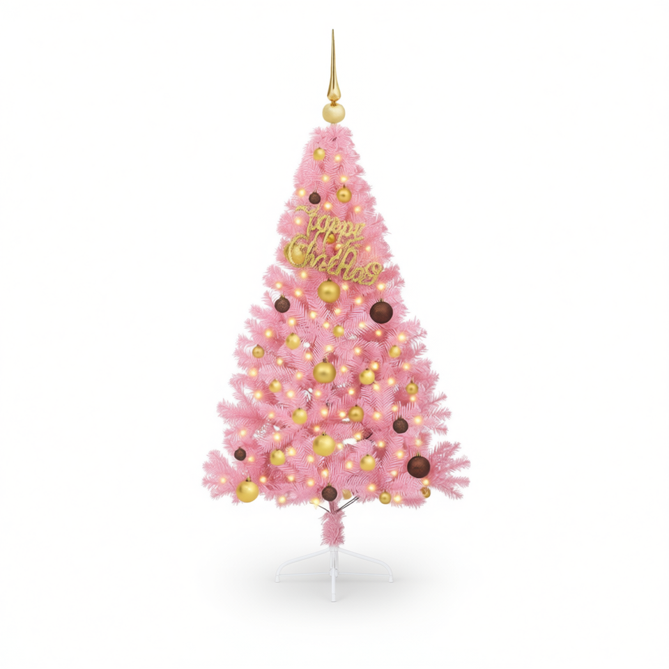 ต้นคริสต์มาสประดิษฐ์พร้อมไฟ 59.06 นิ้ว สีชมพู ทำจาก PVC พร้อมไฟ LED สีขาวอบอุ่น สำหรับตกแต่งภายในบ้าน พร้อมฐานตั้ง