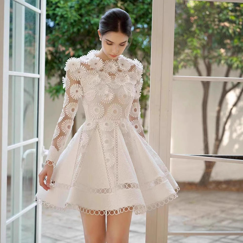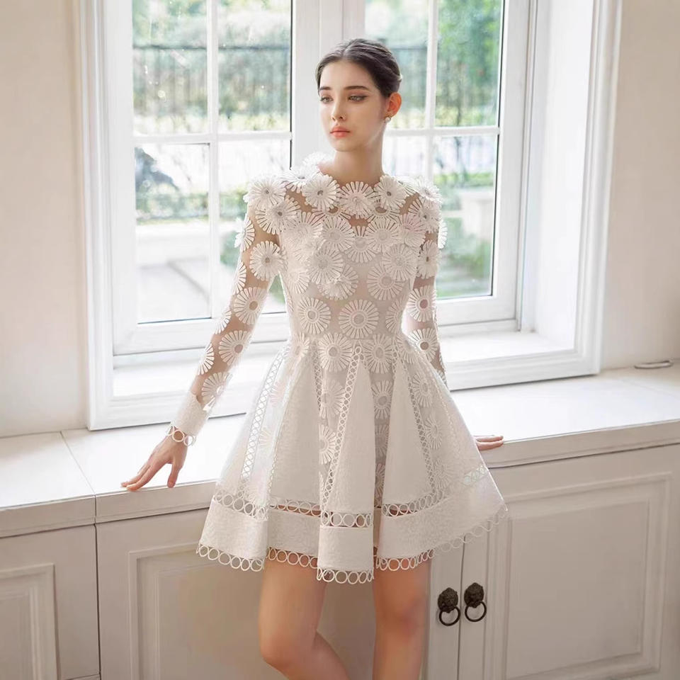 เดรสสั้นเอวอ่อนโยนเดรสสั้นสีขาวผ้าทูลจากร้านบูติกใหม่ดีไซน์แบบเวียดนาม