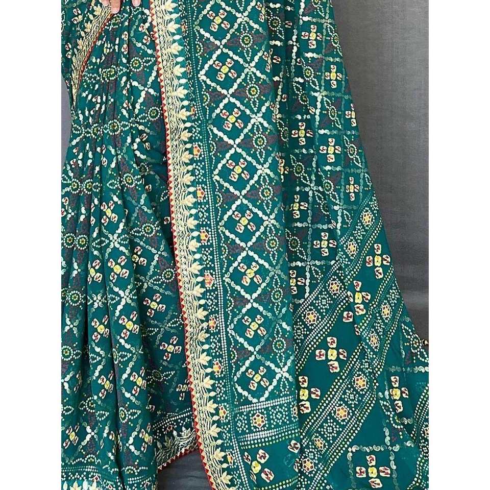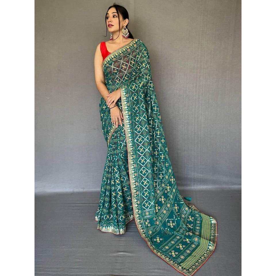 ผ้าซารีจอร์เจียต์พิมพ์ลายสีเขียวทะเลอันล้ำค่า พร้อมเสื้อสำหรับงานเลี้ยงตอนเย็น
