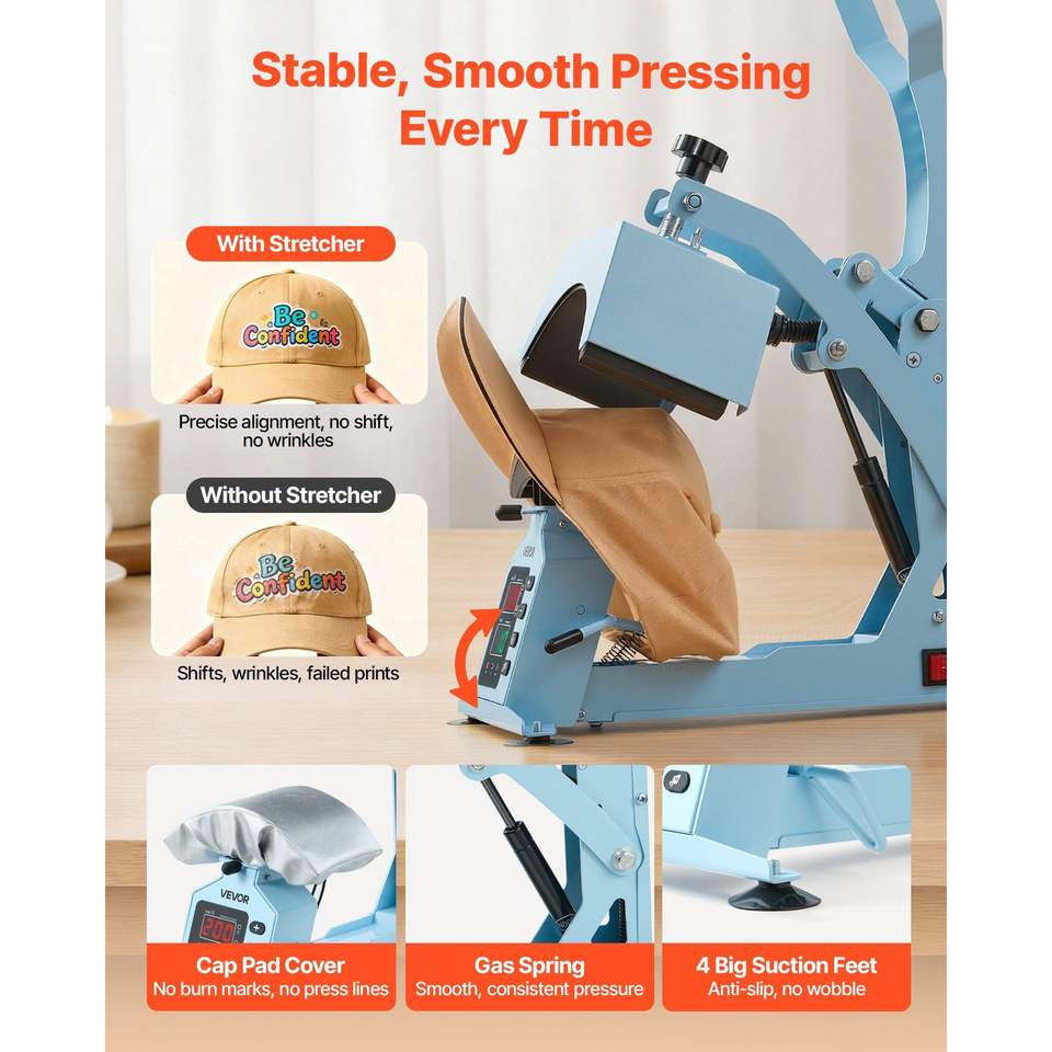 เครื่องรีดร้อนแบบหมวก ควบคุมอุณหภูมิและเวลาได้อย่างแม่นยำ พร้อมแผ่นเปลี่ยนได้ 4 แบบ และอุปกรณ์ยืดหมวก