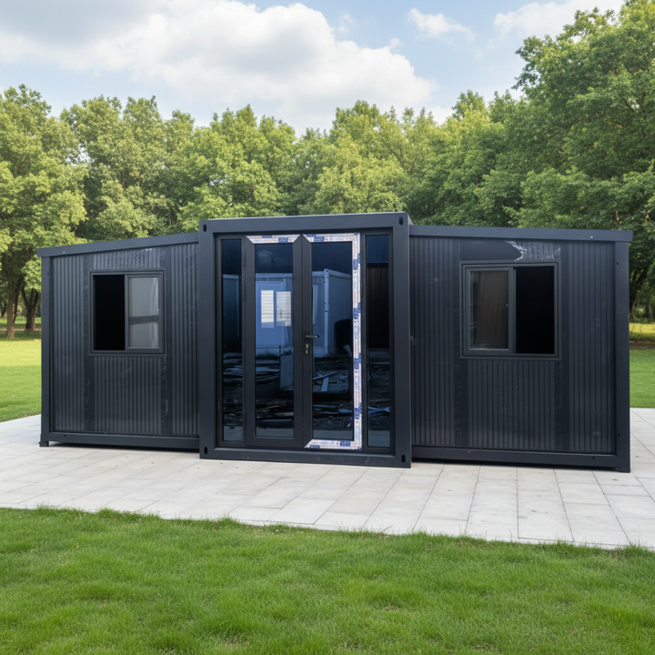 บ้านคอนเทนเนอร์สำเร็จรูปสีดำขนาด 20 ฟุต แบบขยายได้ พร้อมเฟอร์นิเจอร์ รับประกันการค้า Ce Trade Assurance