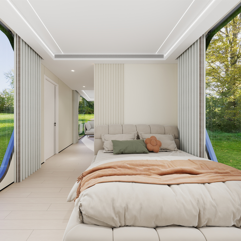 Prefab บ้านหลังเล็กแบบแยกส่วนสุดหรูบ้านแคปซูลเคลื่อนที่ได้พื้นที่ห้องโดยสารสำนักงานพร้อมห้องน้ำสำเร็จรูปโรงแรม