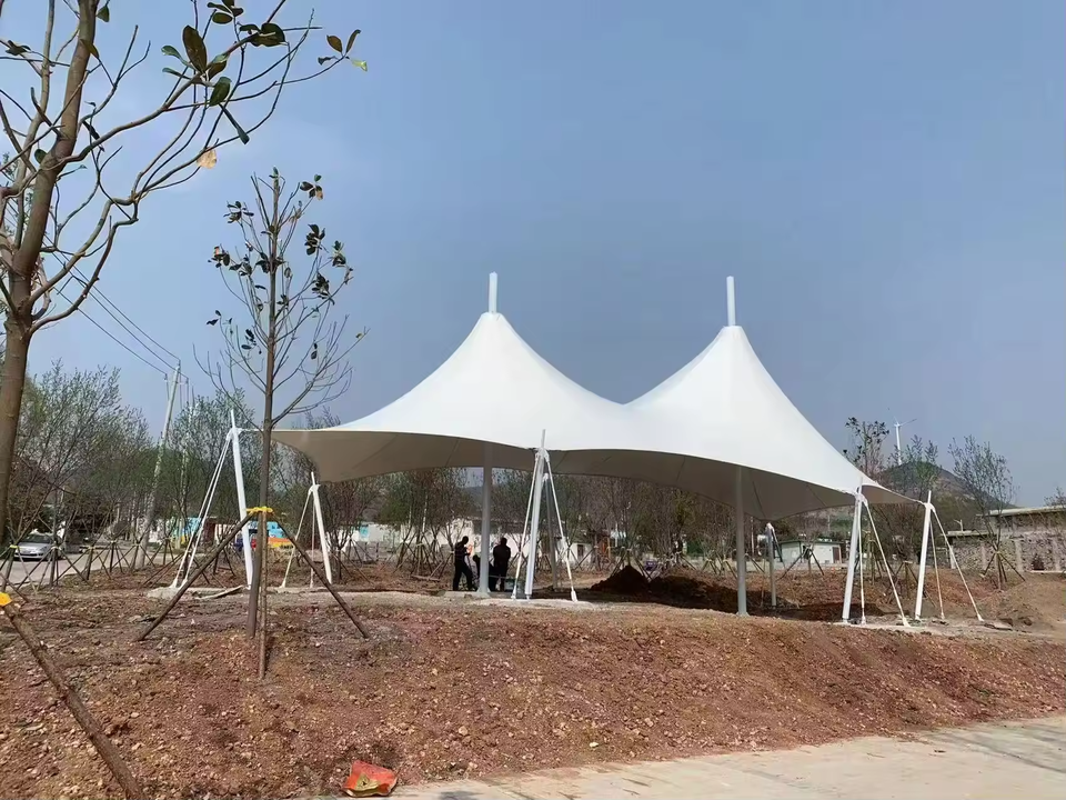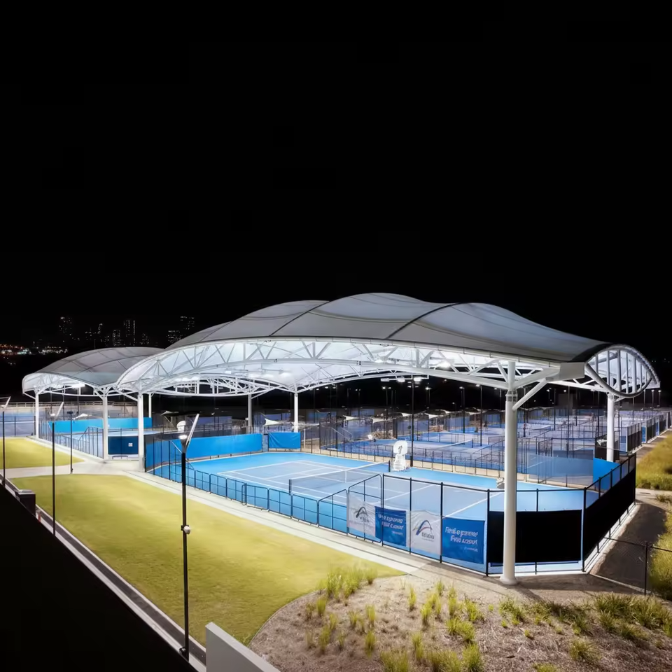 โครงสร้างเหล็กสำเร็จรูป สถาปัตยกรรมแบบดึงดึงด้วยแรงดึง โครงสร้างเมมเบรนผ้า PVDF สำหรับหลังคาสนามแพดเดิลเทนนิส และเต็นท์ฟุตบอล
