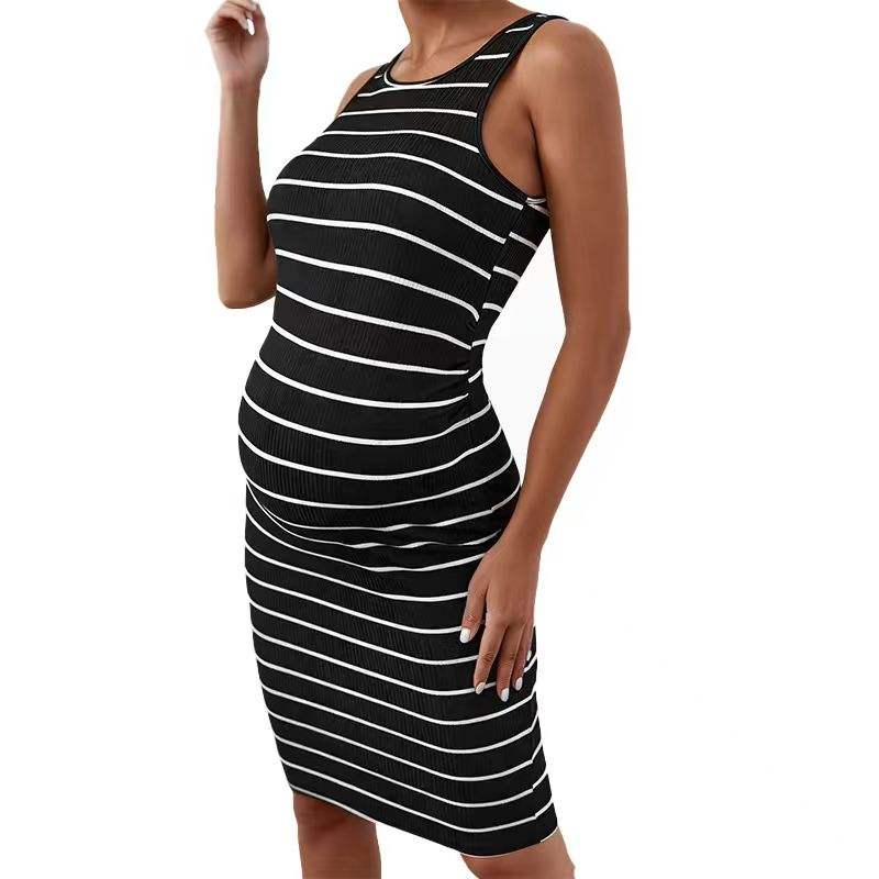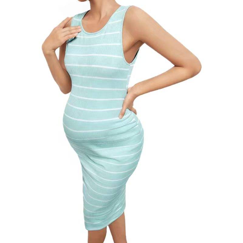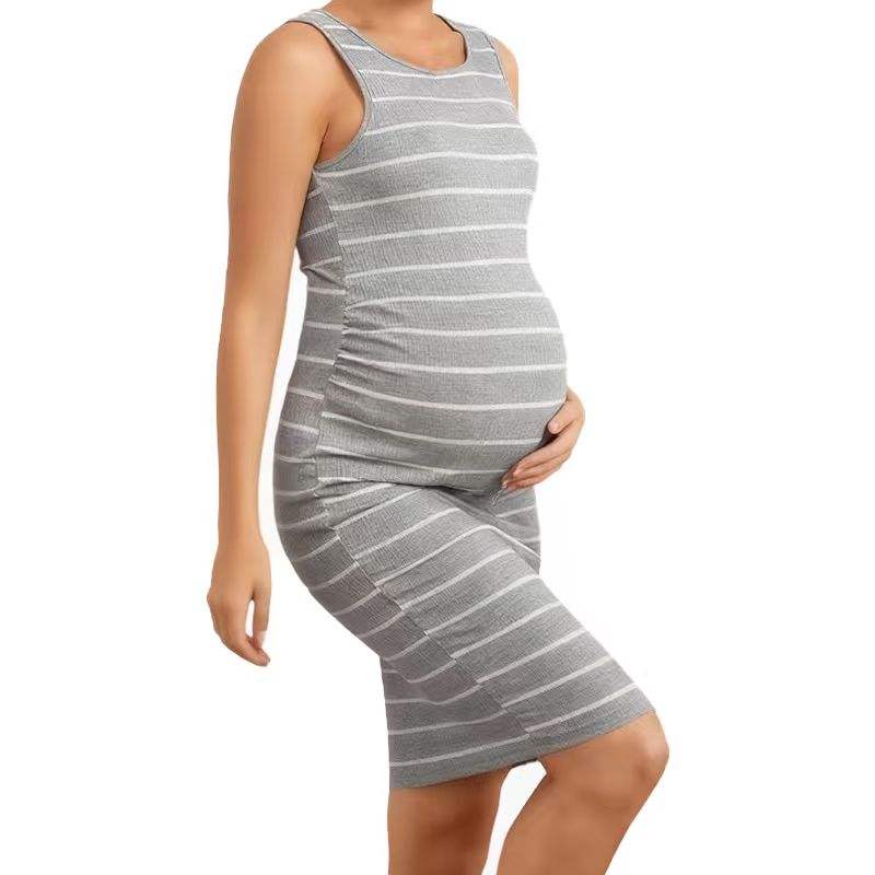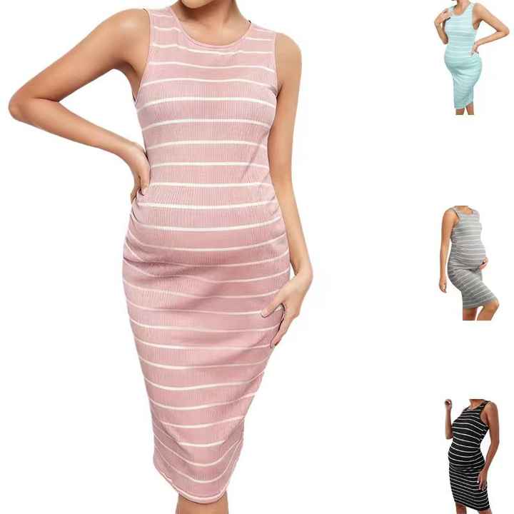 ชุดคลุมท้องสำหรับหญิงตั้งครรภ์ ระบายอากาศได้ดี สำหรับฤดูร้อน คอกลม ลำลอง ลายทาง ยืดหยุ่น กระชับรูปร่าง แขนกุด