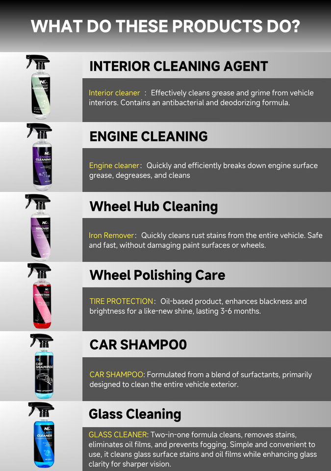 ชุดดูแลรถยนต์ระดับพรีเมียม 6 ชิ้น ประกอบด้วยน้ำยาเคลือบเงารถยนต์ น้ำยาล้างรถ น้ำยาทำความสะอาดกระจก น้ำยาปรับอากาศ น้ำยาทำความสะอาดล้อแม็กซ์ กลิ่นหอมเฉพาะตัว