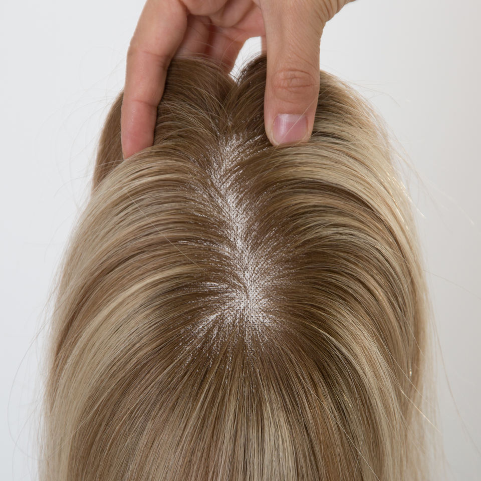 ท็อปเปอร์ผมแท้จากยุโรปเกรดพรีเมียม 3x6x6 รูปทรงลูกแพร์ ฐานโมโน ผมตรงสีน้ำตาลบลอนด์ไล่เฉด ไม่หลุดร่วง สำหรับผู้หญิง