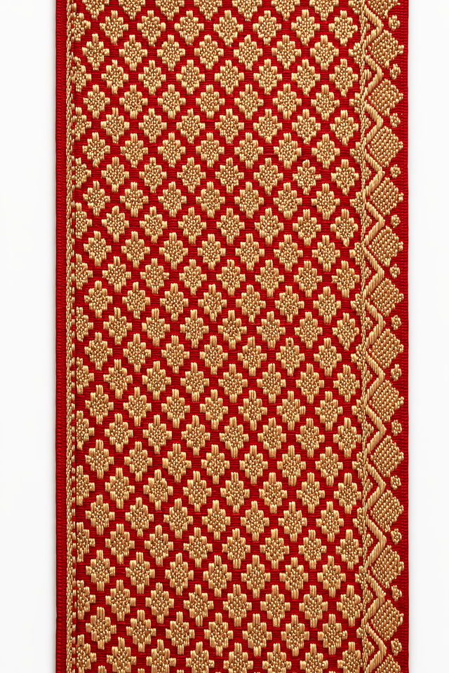 ริบบิ้นผ้าแจ็คการ์ดสีแดงพรีเมียมขนาด 100 มม. ผลิตจากโพลีเอสเตอร์ 100% สำหรับตกแต่งขอบผ้าส่าหรี ลายทอแบบดั้งเดิม