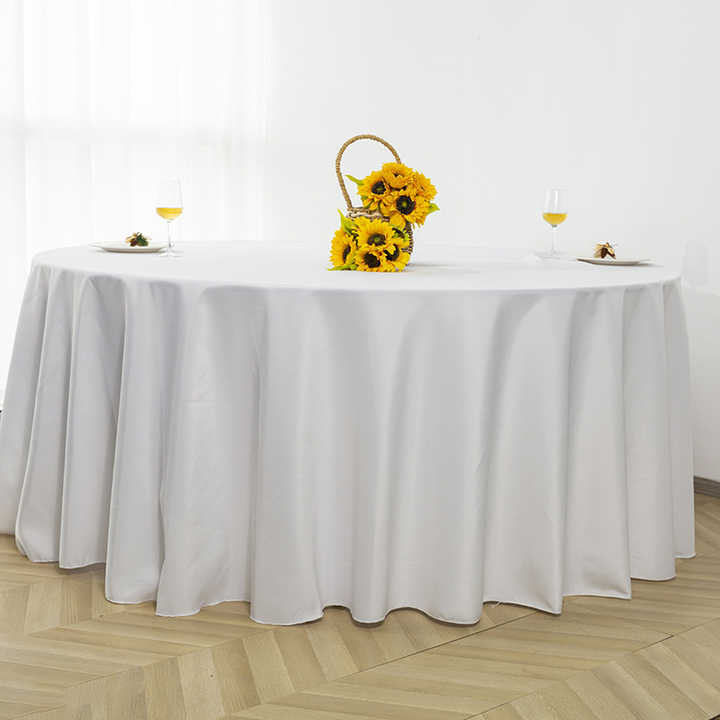 ผ้าคลุมโต๊ะทรงกลม ขนาด 120 นิ้ว สีขาว ป้องกันคราบ ผลิตจากโพลีเอสเตอร์ผสมสแปนเด็กซ์ คุณภาพพรีเมียม สามารถปรับแต่งได้ ซักล้างได้ เหมาะสำหรับใช้ในโรงแรม