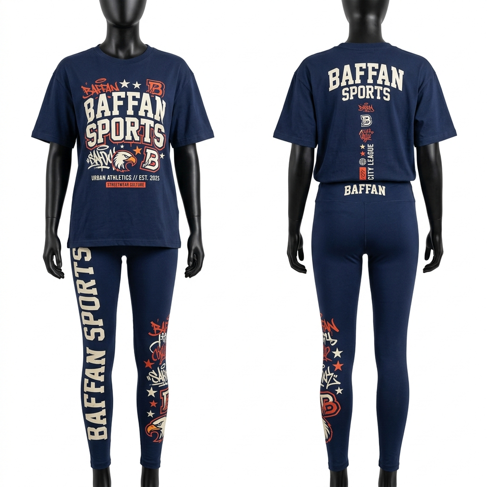 ชุดเสื้อยืดและเลกกิ้งสีน้ำเงินกรมท่า ผ้าคอตตอนผสมโพลีเอสเตอร์ พรีเมียม 180 GSM เนื้อผ้านุ่มยืดหยุ่น พิมพ์โลโก้ได้ตามต้องการ ชุดสำหรับผู้หญิง