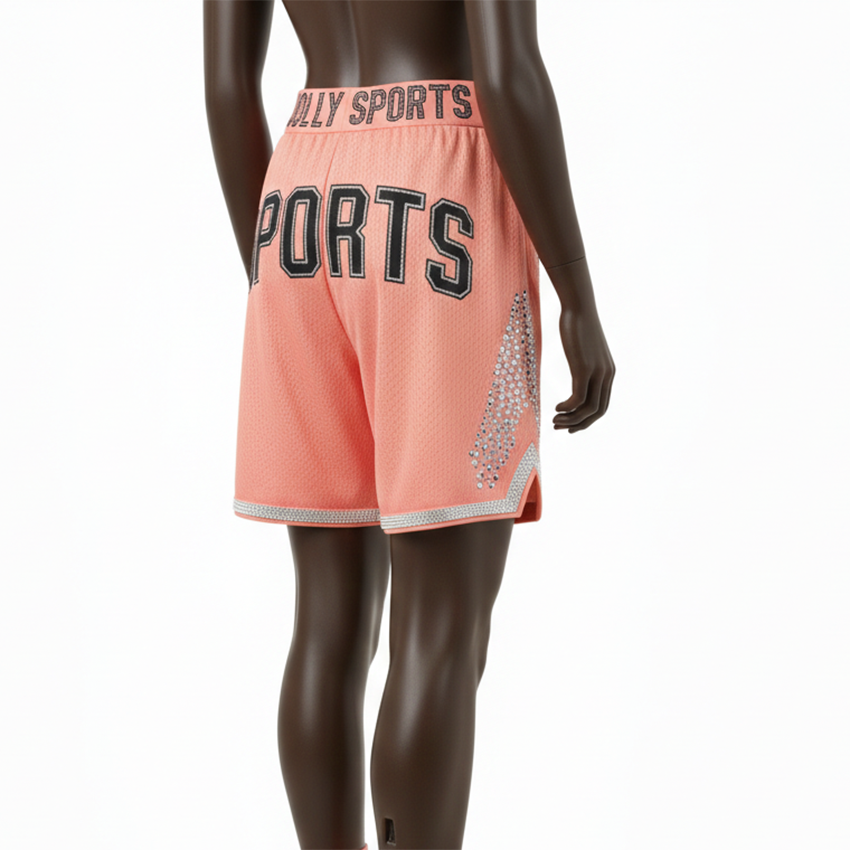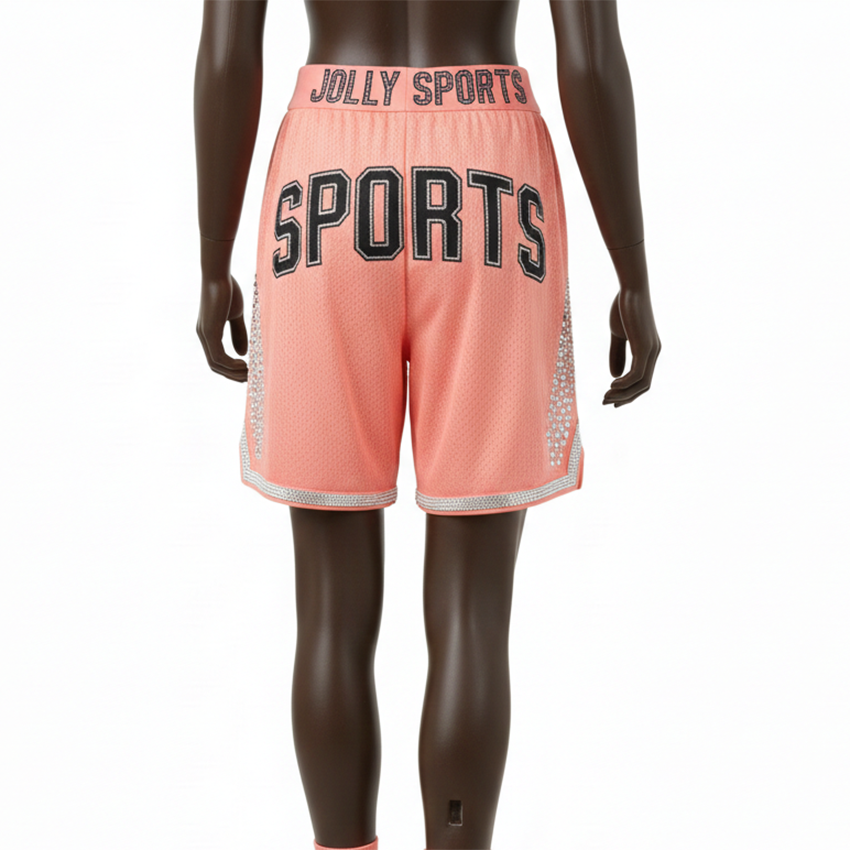กางเกงบาสเก็ตบอลชายผ้าโพลีเอสเตอร์ตาข่ายพรีเมียม 180 GSM สีชมพูพีช แผงข้างคริสตัล โลโก้แบบรีดร้อน กางเกงขาสั้นผู้หญิง