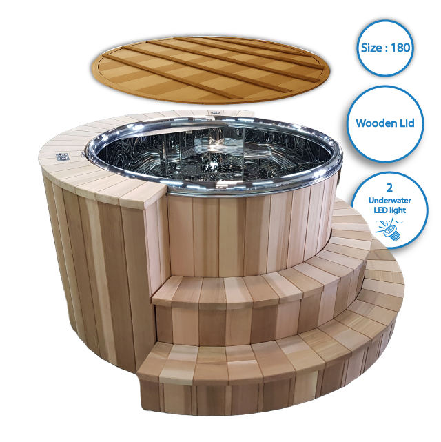 อ่างสปาสแตนเลสแบบตั้งพื้นกลางแจ้งขนาด 180 ซม. พร้อมไฟ LED 2 ดวง บันได 1 อัน และฝาปิด สำหรับโรงแรมและวิลล่า