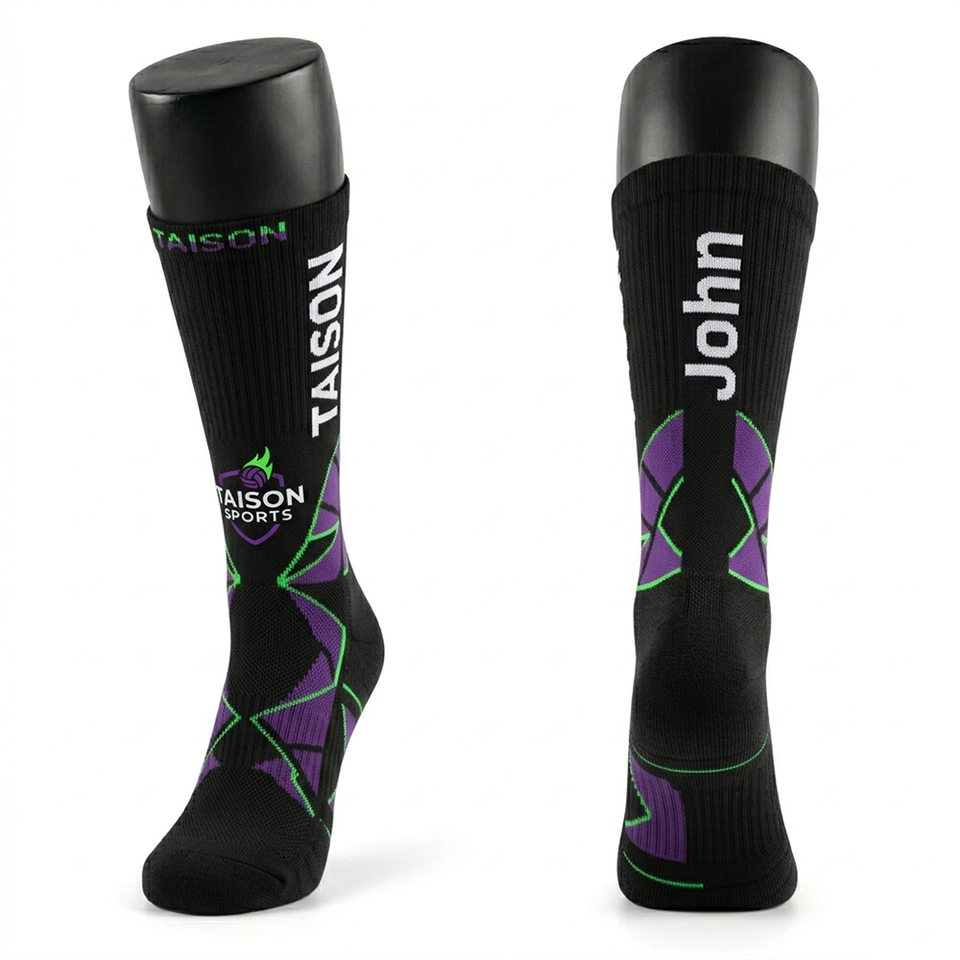 ถุงเท้าเน็ตบอลพรีเมียม 200 GSM ผ้าฝ้ายผสมโพลีเอสเตอร์และสแปนเด็กซ์ สีฟ้าอมเขียว ดีไซน์ลายแผง รองรับการสั่งทำโลโก้แบบจาการ์ดถัก