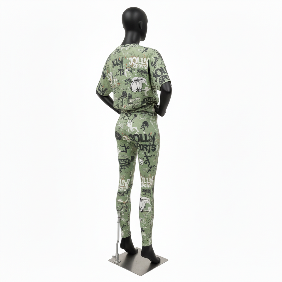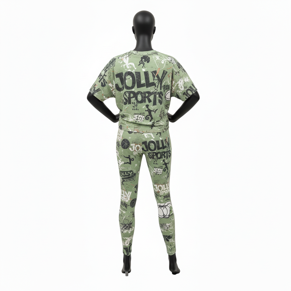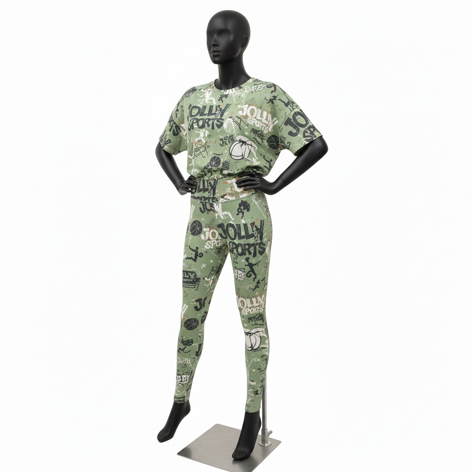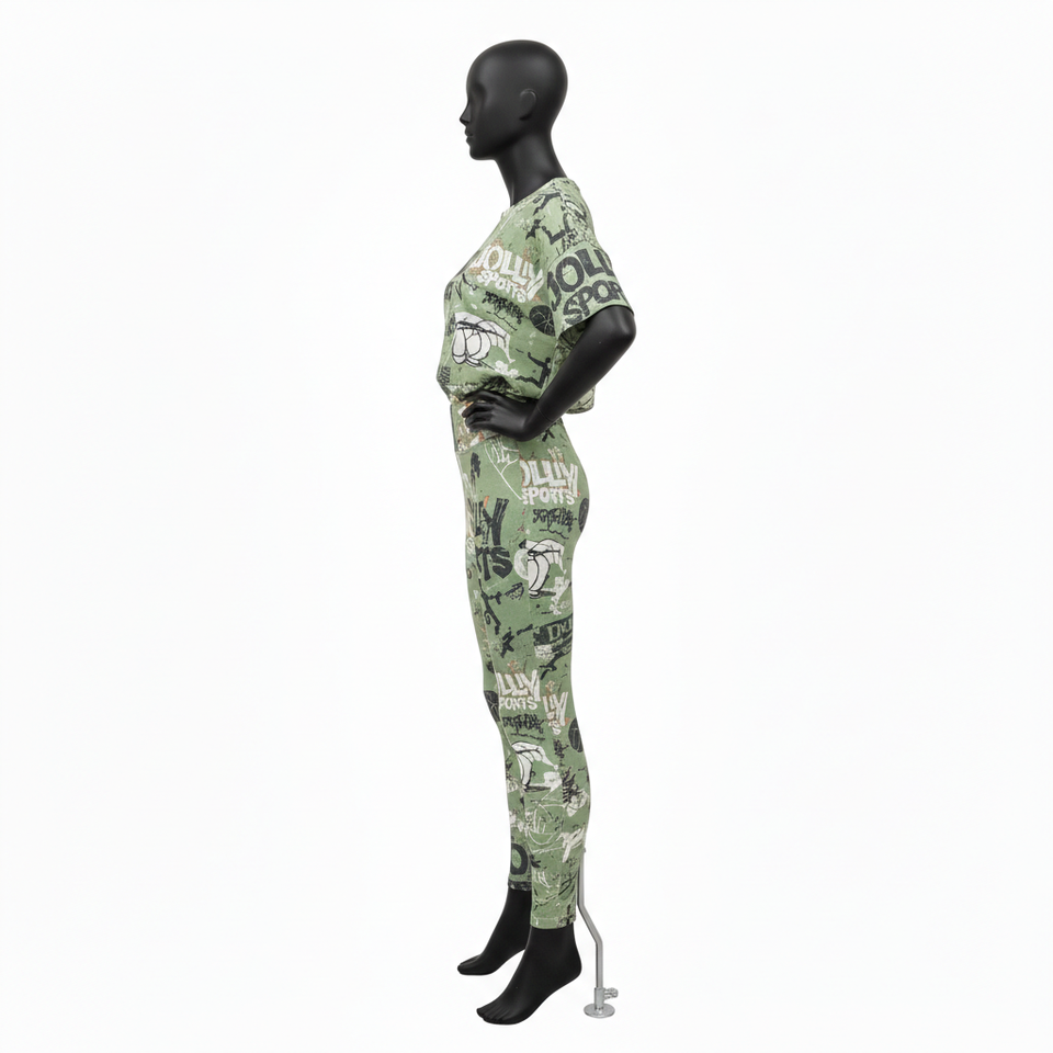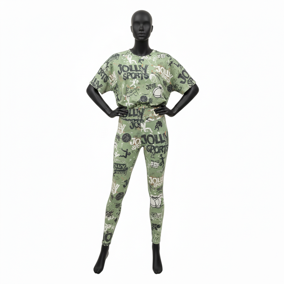 ชุดเสื้อยืดและเลกกิ้งผู้หญิง พรีเมียม 200 GSM โพลีเอสเตอร์ผสมสแปนเด็กซ์ สีเขียวมะกอก พิมพ์ลายโลโก้แบบซับลิเมชั่นทั้งตัว ชุดเซ็ตสำหรับผู้หญิง