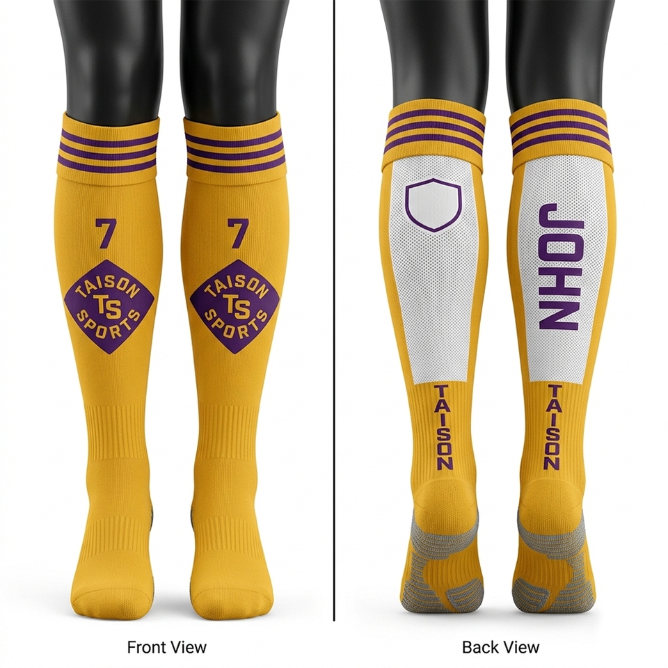 ถุงเท้ากีฬาฟุตบอลหญิง พรีเมียม 220 GSM ระบายอากาศได้ดี ผลิตจากผ้าโพลีเอสเตอร์ผสมไนลอน สีเหลืองม่วง ดีไซน์แผงถักแบบนุ่มพิเศษ พร้อมโลโก้แบบกำหนดเอง