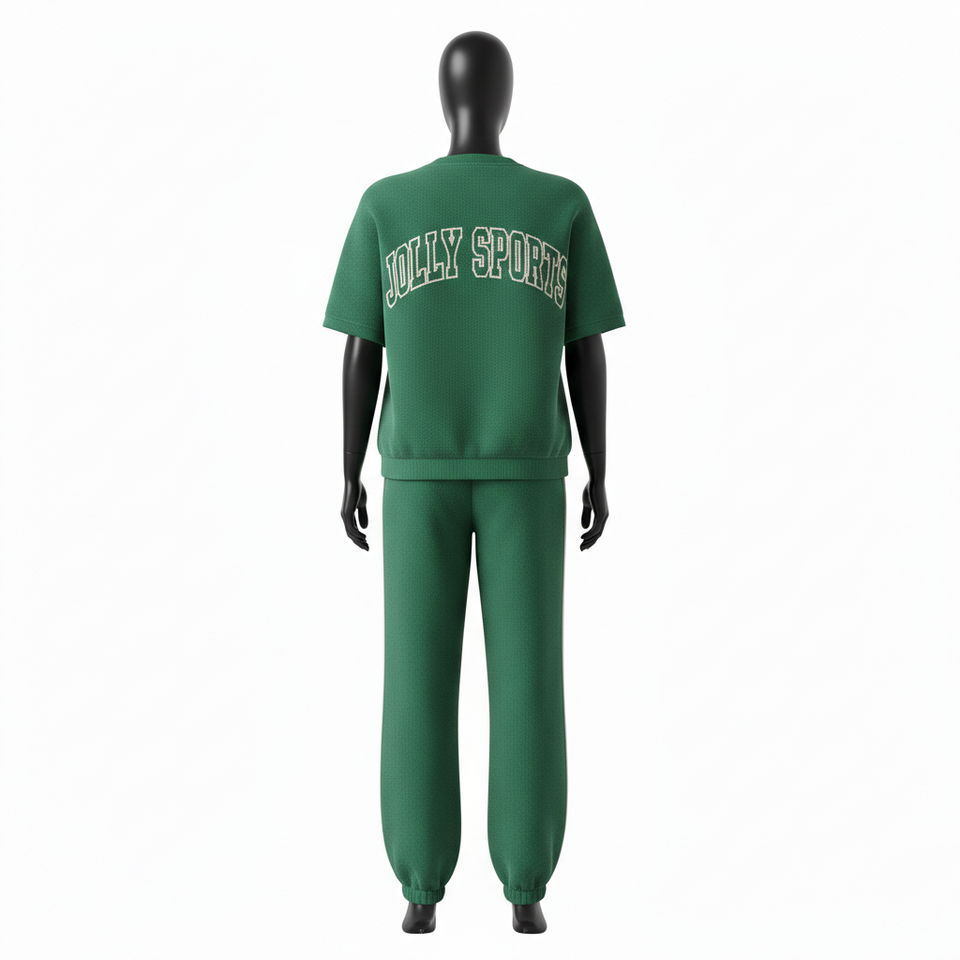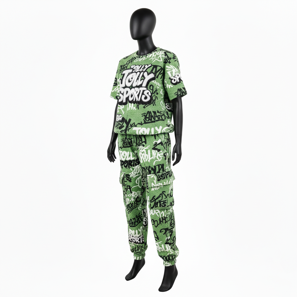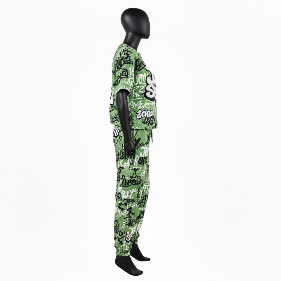 ชุดเสื้อยืดและกางเกงผ้าฟลีซคอตตอนโพลีเอสเตอร์พรีเมียม 220 GSM ลายกราฟฟิตีสีเขียว พิมพ์ลายพัฟสกรีน พร้อมโลโก้สั่งทำพิเศษสำหรับผู้หญิง