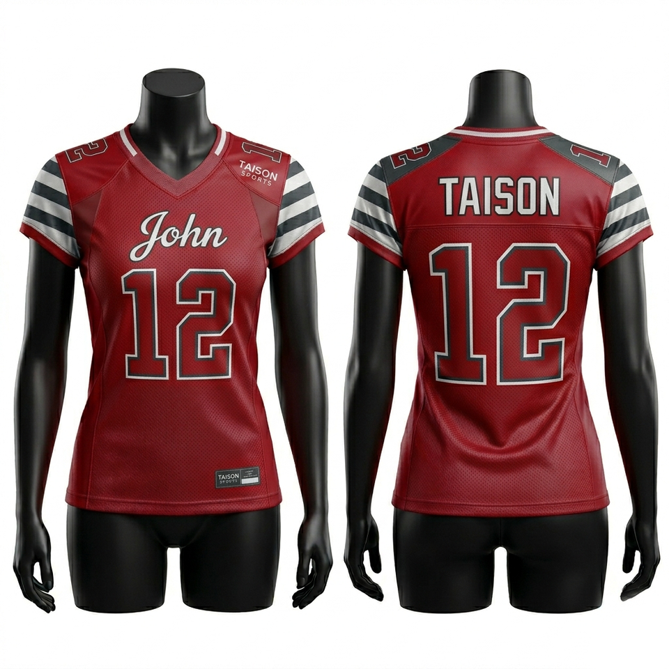 เสื้อเจอร์ซีย์อเมริกันฟุตบอลหญิง ผ้าโพลีเอสเตอร์ตาข่าย 220 GSM พรีเมียม สีแดง-เทา ลายแถบ ดีไซน์ระบายอากาศได้ดี พร้อมสกรีนโลโก้ตามสั่ง