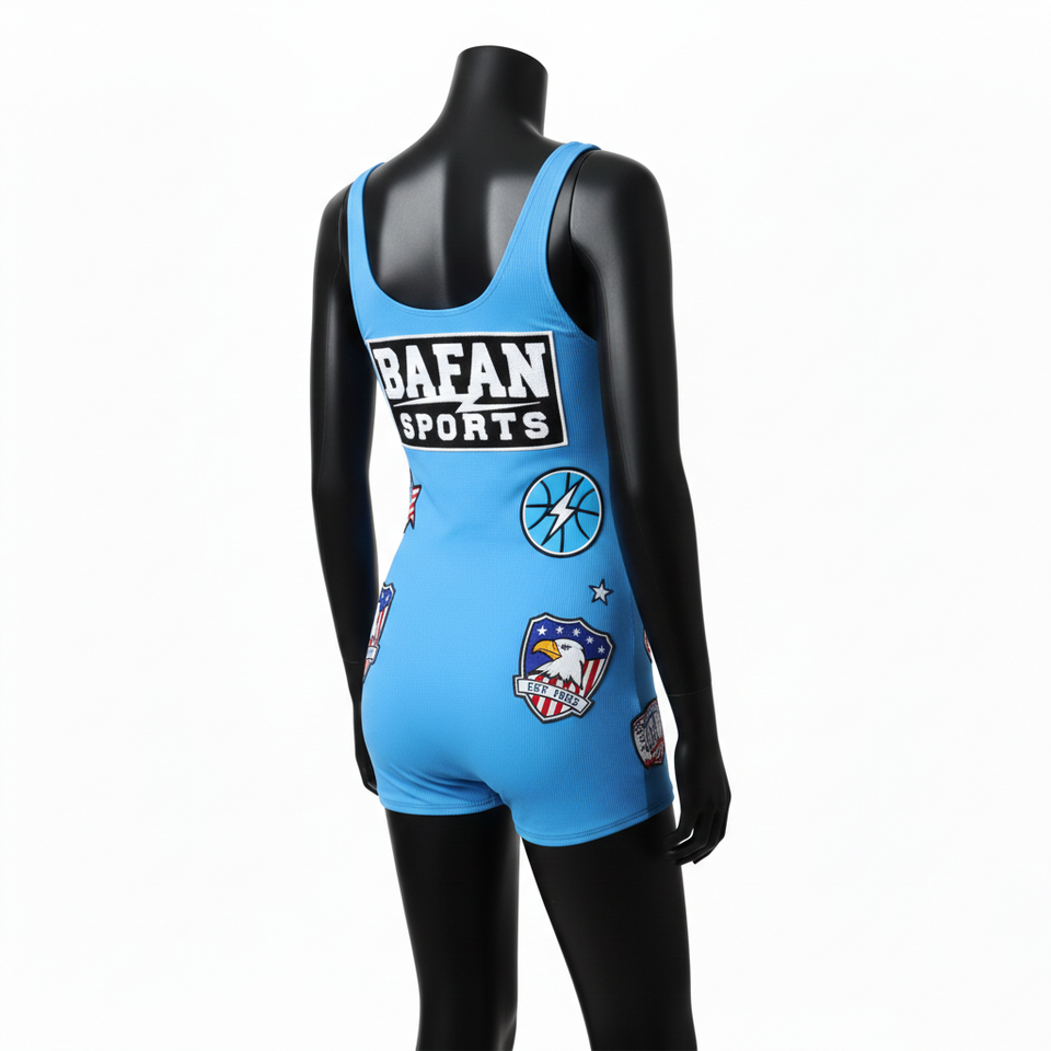 ชุดว่ายน้ำวันพีซสีน้ำเงิน พรีเมียม 220 GSM โพลีเอสเตอร์ผสมสแปนเด็กซ์ พร้อมโลโก้ปักแบบซับลิเมชั่น ดีไซน์สั่งทำพิเศษสำหรับผู้หญิง