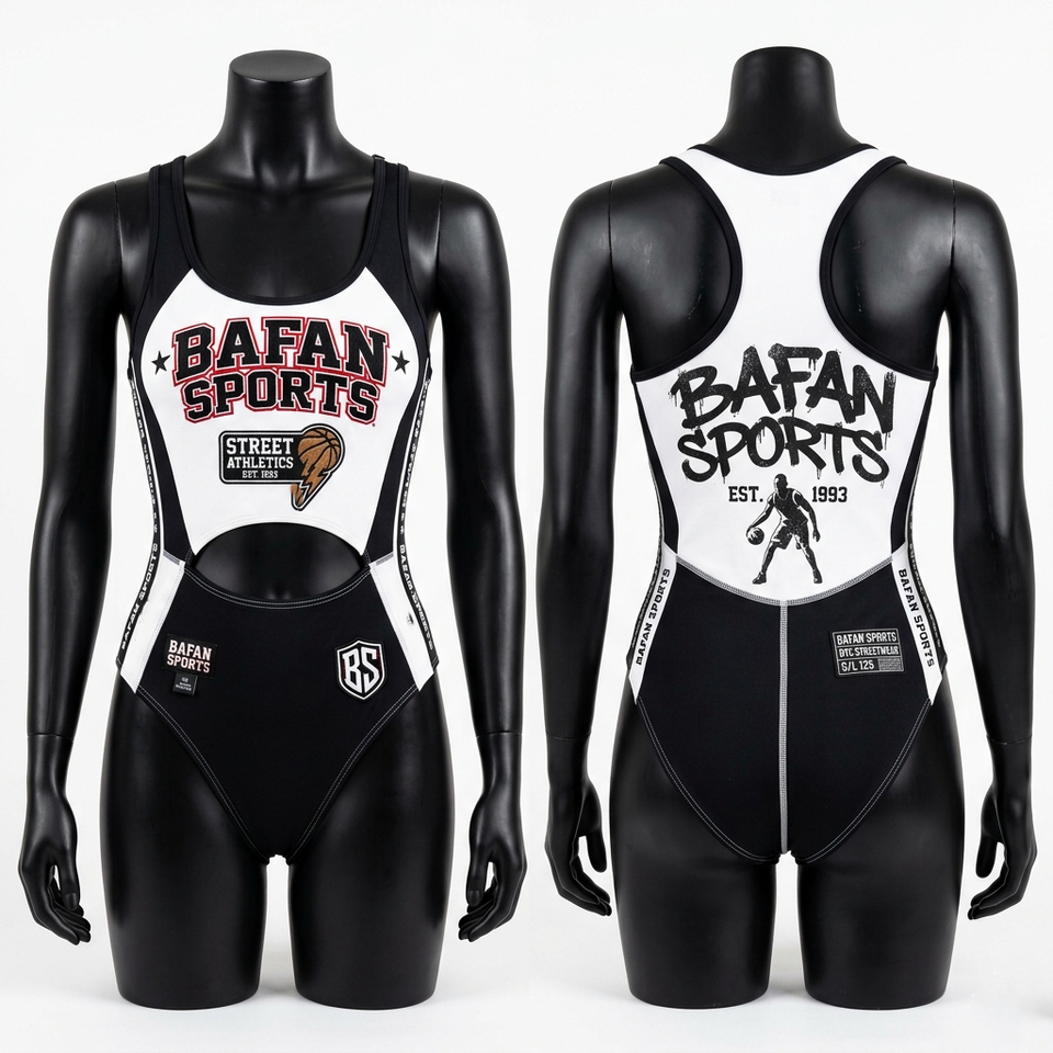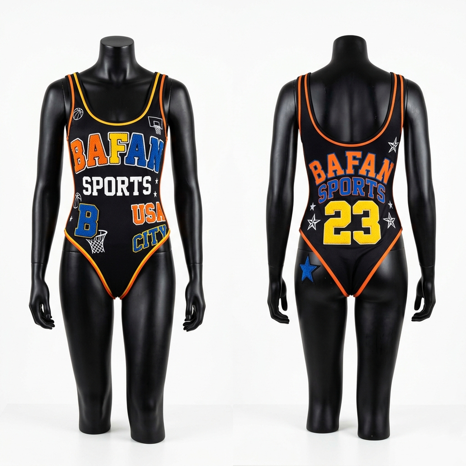 ชุดว่ายน้ำพรีเมียม 240 GSM โพลีเอสเตอร์ผสมอีลาสเทน สีน้ำเงิน-ส้ม แบบ Racerback พร้อมโลโก้แบบรีดร้อนตามสั่ง สำหรับผู้หญิง